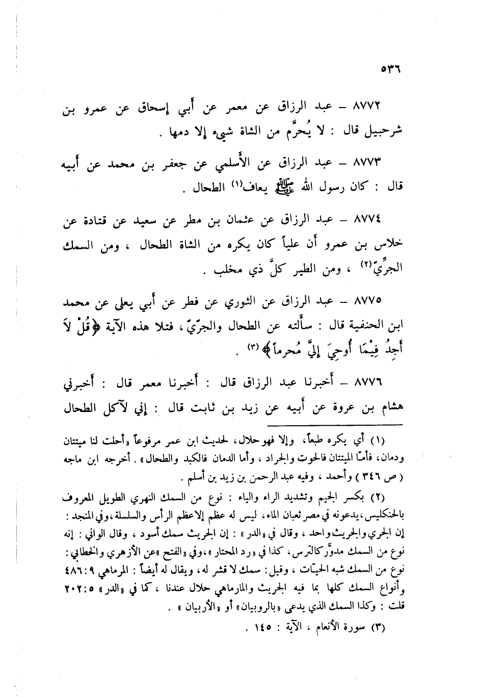 8777 - عَبْدُ الرَّزَّاقِ قَالَ: أَخْبَرَنَا ابْنُ عُيَيْنَةَ، عَنْ مُحَمَّدِ بْنِ إِسْحَاقَ قَالَ: قُلْتُ لِأَبِي: جَعْفَرُ بْنُ مُحَمَّدِ بْنِ عَلِيٍّ: بَلَغَهُ، أَنَّ عَلِيًّا، كَانَ لَا يَأْكُلُ لَحْمَ الْجِرِّيثِ، وَلَا يَدْخُلُ بَيْتًا فِيهِ صُورَةٌ، وَلَا يَأْكُلُ الطِّحَالَ قَالَ: أَمَّا §الطِّحَالُ، فَإِنَّ رَسُولَ اللَّهِ صَلَّى اللهُ عَلَيْهِ وَسَلَّمَ قَذَرَهُ، وَلَمْ يَأْكُلْهُ، وَقَالَ: «إِنَّمَا هُوَ مَجْمَعُ الدَّمِ» فَكَانَ عَلِيٌّ لَا يَأْكُلُهُ، وَأَمَّا بَيْتٌ فِيهِ صُورَةٌ فَإِنَّ النَّبِيَّ صَلَّى اللهُ عَلَيْهِ وَسَلَّمَ «كَانَ لَا يَدْخُلُ بَيْتًا فِيهِ صُورَةٌ، وَأَمَّا الْجِرِّيثُ، فَإِنَّهُ حُوتٌ لَا يَأْكُلُهُ أَهْلُ الْكِتَابِ»