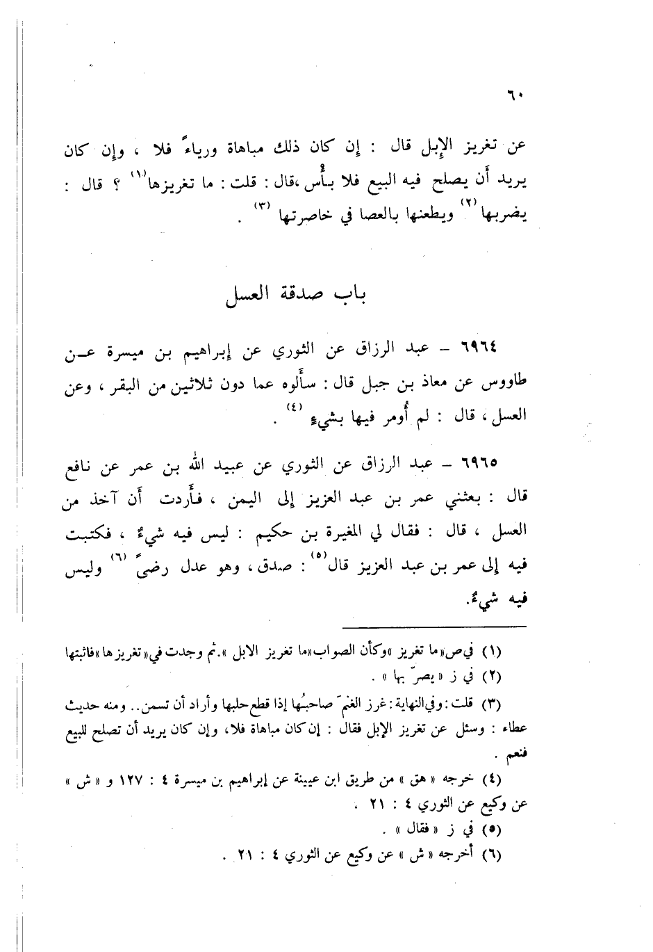 6965 - عَنِ الثَّوْرِيِّ، عَنْ عُبَيْدِ اللَّهِ بْنِ عُمَرَ، عَنْ نَافِعٍ قَالَ: بَعَثَنِي عُمَرُ بْنُ عَبْدِ الْعَزِيزِ إِلَى الْيَمَنِ، §فَأَرَدْتُ أَنْ آخُذَ مِنَ الْعَسَلِ قَالَ: فَقَالَ لِي الْمُغِيرَةُ بْنُ حَكِيمٍ: لَيْسَ فِيهِ شَيْءٌ، فَكَتَبْتُ فِيهِ إِلَى عُمَرَ بْنِ عَبْدِ الْعَزِيزِ قَالَ: «صَدَقَ، وَهَوَ عَدْلٌ رَضِيٌّ، وَلَيْسَ فِيهِ شَيْءٌ»