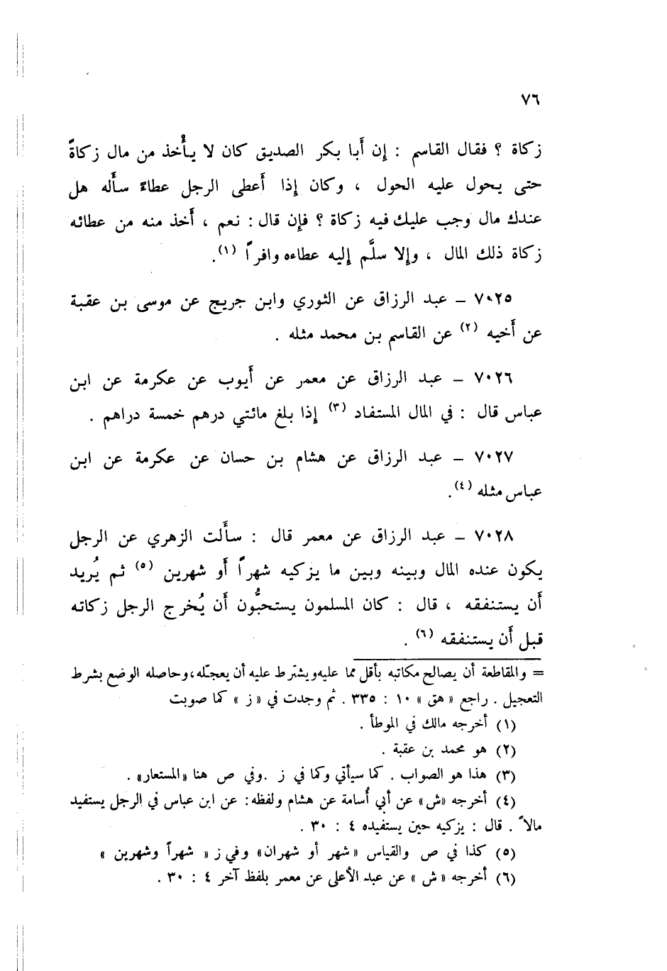 7028 - عَنْ مَعْمَرٍ قَالَ: سَأَلْتُ الزُّهْرِيَّ عَنِ الرَّجُلِ يَكُونُ عِنْدَهُ الْمَالُ وَبَيْنَهُ وَبَيْنَ مَا يُزَكِّيهِ شَهْرٌ أَوْ شَهْرَانِ ثُمَّ يُرِيدُ أَنْ يَسْتَنْفِقَهُ قَالَ: «كَانَ §الْمُسْلِمُونَ يَسْتَحِبُّونَ أَنْ يُخْرِجَ الرَّجُلَ زَكَاتَهُ قَبْلَ أَنْ يَسْتَنْفِقَهُ»