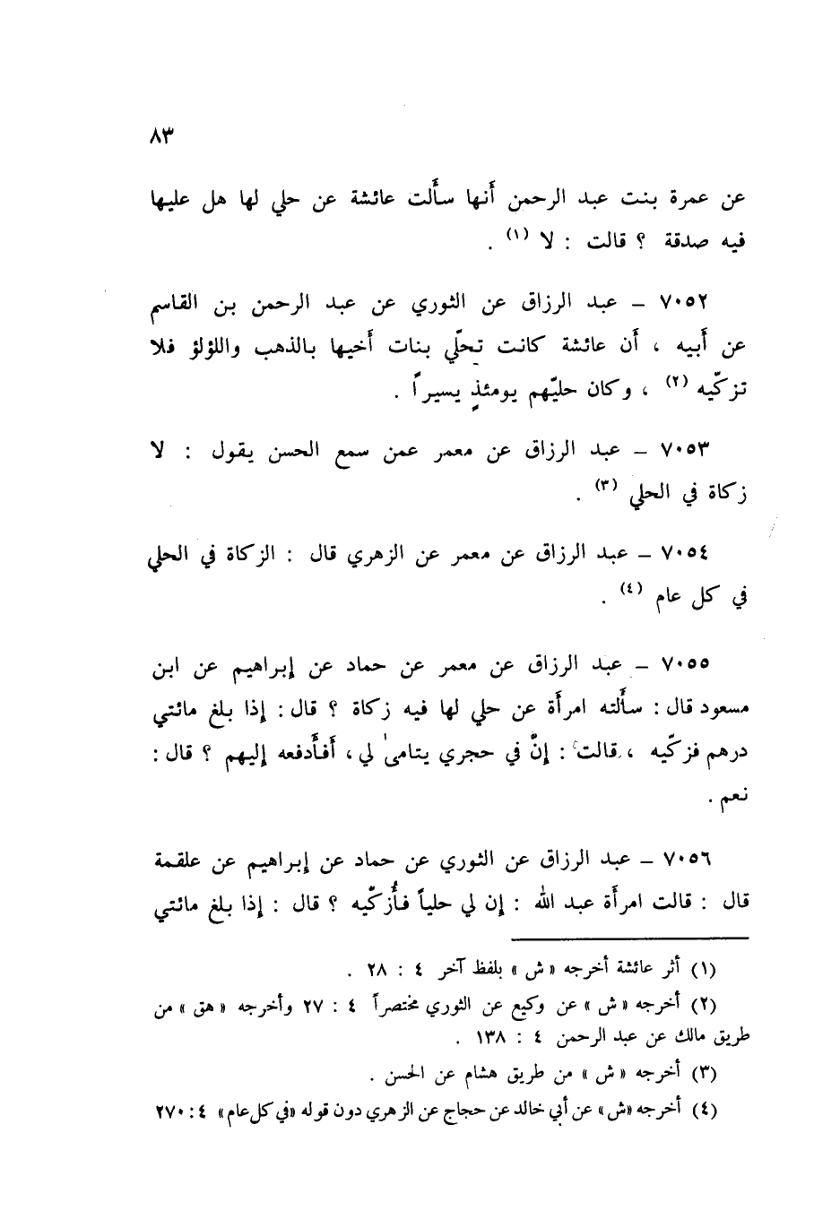 7055 - عَنْ مَعْمَرٍ، عَنْ حَمَّادٍ، عَنْ إِبْرَاهِيمَ، عَنِ ابْنِ مَسْعُودٍ قَالَ: سَأَلَتْهُ امْرَأَةٌ عَنْ حُلِيٍّ، لَهَا فِيهِ زَكَاةٌ؟ قَالَ: «إِذَا بَلَغَ مِائَتَيْ دِرْهَمٍ فَزَكِّيهِ» قَالَتْ: §إِنَّ فِي حِجْرِي يَتَامَى لِي أَفَأَدْفَعَهُ إِلَيْهِمْ؟ قَالَ: «نَعَمْ»