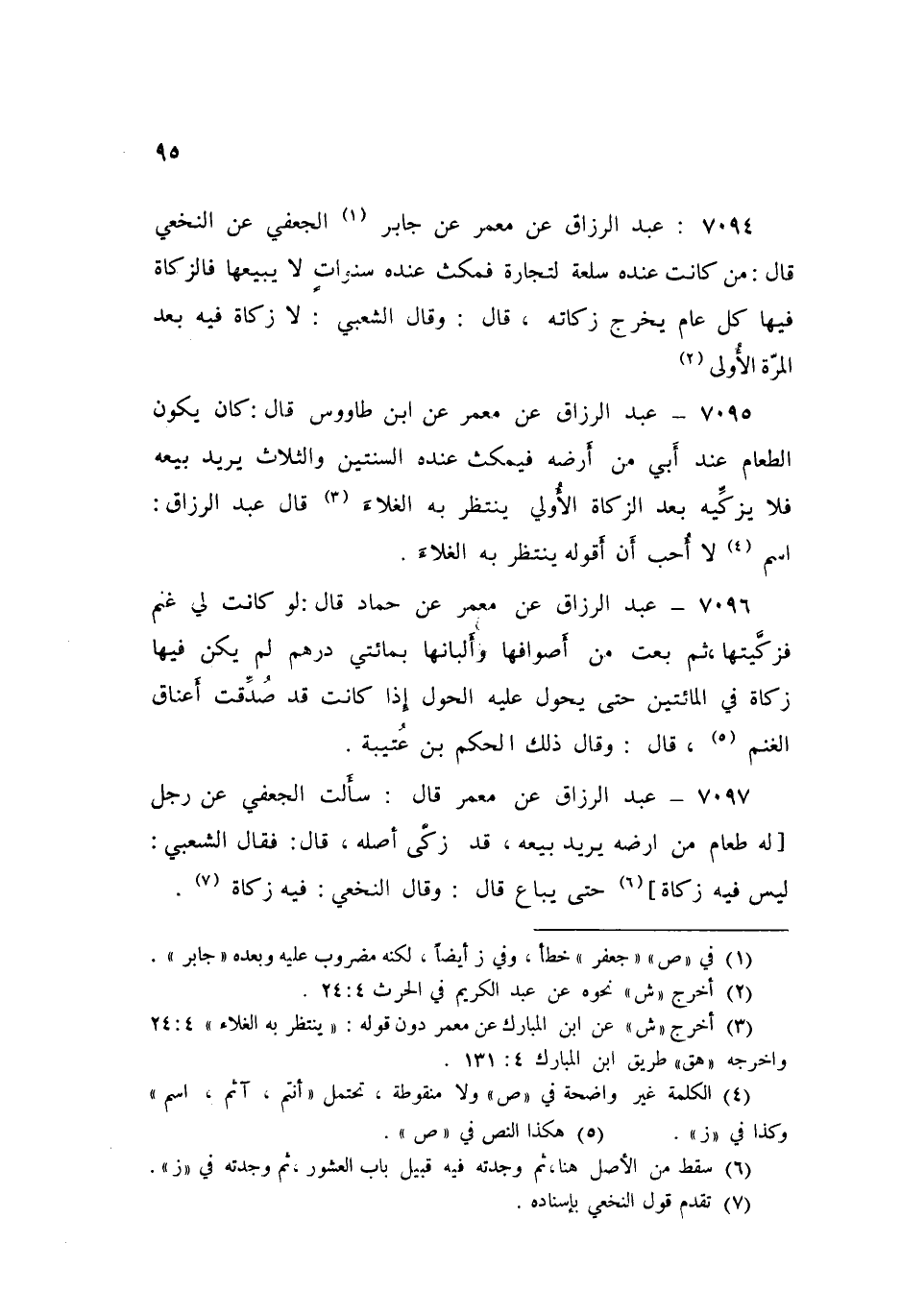 7095 - عَنْ مَعْمَرٍ، عَنِ ابْنِ طَاوُسٍ قَالَ: «كَانَ يَكُونُ §الطَّعَامُ عِنْدَ أَبِي مِنْ أَرْضِهِ، فَيَمْكُثُ عِنْدَهُ السَّنَتَيْنِ، وَالثَّلَاثَ يُرِيدُ بَيْعَهُ، فَلَا يُزَكِّيهِ بَعْدَ الزَّكَاةِ الْأُولَى يَنْتَظِرُ بِهِ الْغَلَاءَ»، قَالَ عَبْدُ الرَّزَّاقِ: «اسْمُ لَا أُحِبُّ أَنْ أَقُولَهُ يَنْتَظِرُ بِهِ الْغَلَاءَ»