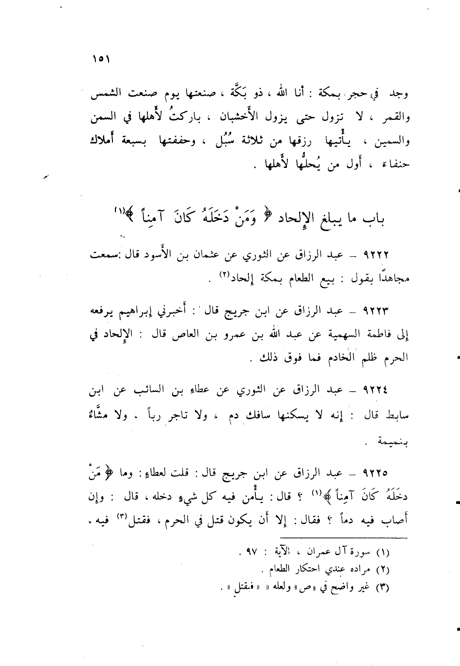9225 - عَنِ ابْنِ جُرَيْجٍ قَالَ: قُلْتُ لِعَطَاءٍ: وَمَا {§مَنْ دَخَلَهُ كَانَ آمِنًا} [آل عمران: 97] قَالَ: «يَأْمَنُ فِيهِ كُلُّ شَيْءٍ دَخَلَهُ» قَالَ: وَإِنْ أَصَابَ فِيهِ دَمًا؟ فَقَالَ: " إِلَّا أَنْ يَكُونَ قَتَلَ فِي الْحَرَمِ، فَقُتِلَ فِيهِ قَالَ: وَتَلَا: {عِنْدَ الْمَسْجِدِ الْحَرَامِ حَتَّى يُقَاتِلُوكُمْ فِيهِ} [البقرة: 191] فَإِنْ كَانَ قَتَلَ فِي غَيْرِهِ، ثُمَّ دَخَلَهُ أَمِنَ، حَتَّى يَخْرُجَ مِنْهُ " فَقَالَ لِي: أَنْكَرَ ابْنُ عَبَّاسٍ قَتْلَ ابْنِ الزُّبَيْرِ سَعْدًا مَوْلَى عُتْبَةَ وَأَصْحَابَهِ " قَالَ: " تَرَكَهُ فِي الْحِلِّ حَتَّى إِذَا دَخَلَ الْحَرَمَ أَخْرَجَهُ مِنْهُ فَقَتَلَهُ. قَالَ لَهُ سُلَيْمَانُ بْنُ مُوسَى: فَعَبْدٌ أَبَقَ فَدَخَلَهُ، فَقَالَ: خُذْهُ فَإِنَّكَ لَا تَأْخُذُهُ لِتَقْتُلَهُ "