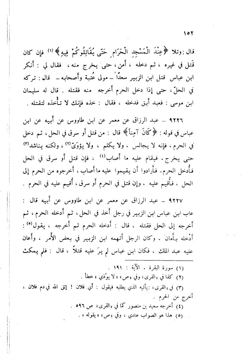 9227 - عَنْ مَعْمَرٍ، عَنِ ابْنِ طَاوُسٍ، عَنْ أَبِيهِ قَالَ: §عَابَ ابْنُ عَبَّاسٍ ابْنَ الزُّبَيْرِ فِي رَجُلٍ أَخَذَ فِي الْحِلِّ، ثُمَّ أَدْخَلَهُ الْحَرَمَ، ثُمَّ أَخْرَجَهُ إِلَى الْحِلِّ فَقَتَلَهُ قَالَ: «أَدْخَلَهُ الْحَرَمَ ثُمَّ أَخْرَجَهُ» يَقُولُ: «أَدْخَلَهُ بِأَمَانٍ» وَكَانَ الرَّجُلُ اتَّهَمَهُ ابْنُ الزُّبَيْرِ فِي بَعْضِ الْأَمْرِ، وَأَعَانَ عَلَيْهِ عَبْدَ الْمَلِكِ، فَكَانَ ابْنُ عَبَّاسٍ لَمْ يَرَ عَلَيْهِ قَتْلًا قَالَ: فَلَمْ يَمْكُثُ ابْنُ الزُّبَيْرِ بَعْدَهُ إِلَّا قَلِيلًا حَتَّى هَلَكَ "