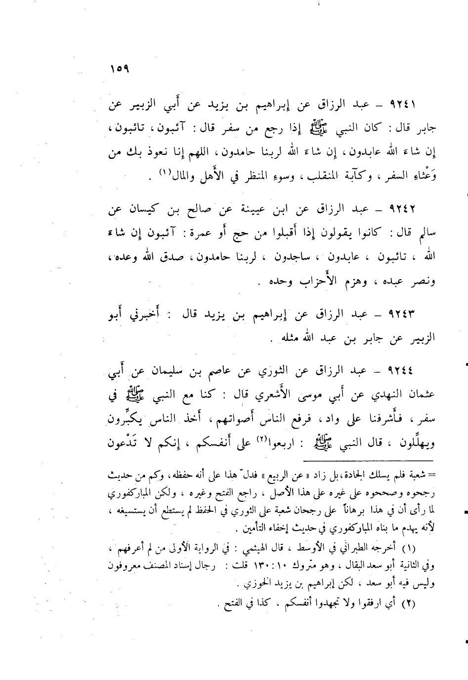 9242 - عَنِ ابْنِ عُيَيْنَةَ، عَنْ صَالِحِ بْنِ كَيْسَانَ، عَنْ سَالِمٍ قَالَ: كَانُوا يَقُولُونَ إِذَا أَقْبَلُوا مِنْ حَجٍّ أَوْ عُمْرَةٍ: «§آئِبُونَ، إِنْ شَاءَ اللَّهُ تَائِبُونَ، عَابِدُونَ، سَاجِدُونَ، لِرَبِّنَا حَامِدُونَ، صَدَقَ اللَّهُ وَعْدَهُ، وَنَصَرَ عَبْدَهُ، وَهَزَمَ الْأَحْزَابَ وَحْدَهُ»، عَبْدُ الرَّزَّاقِ،