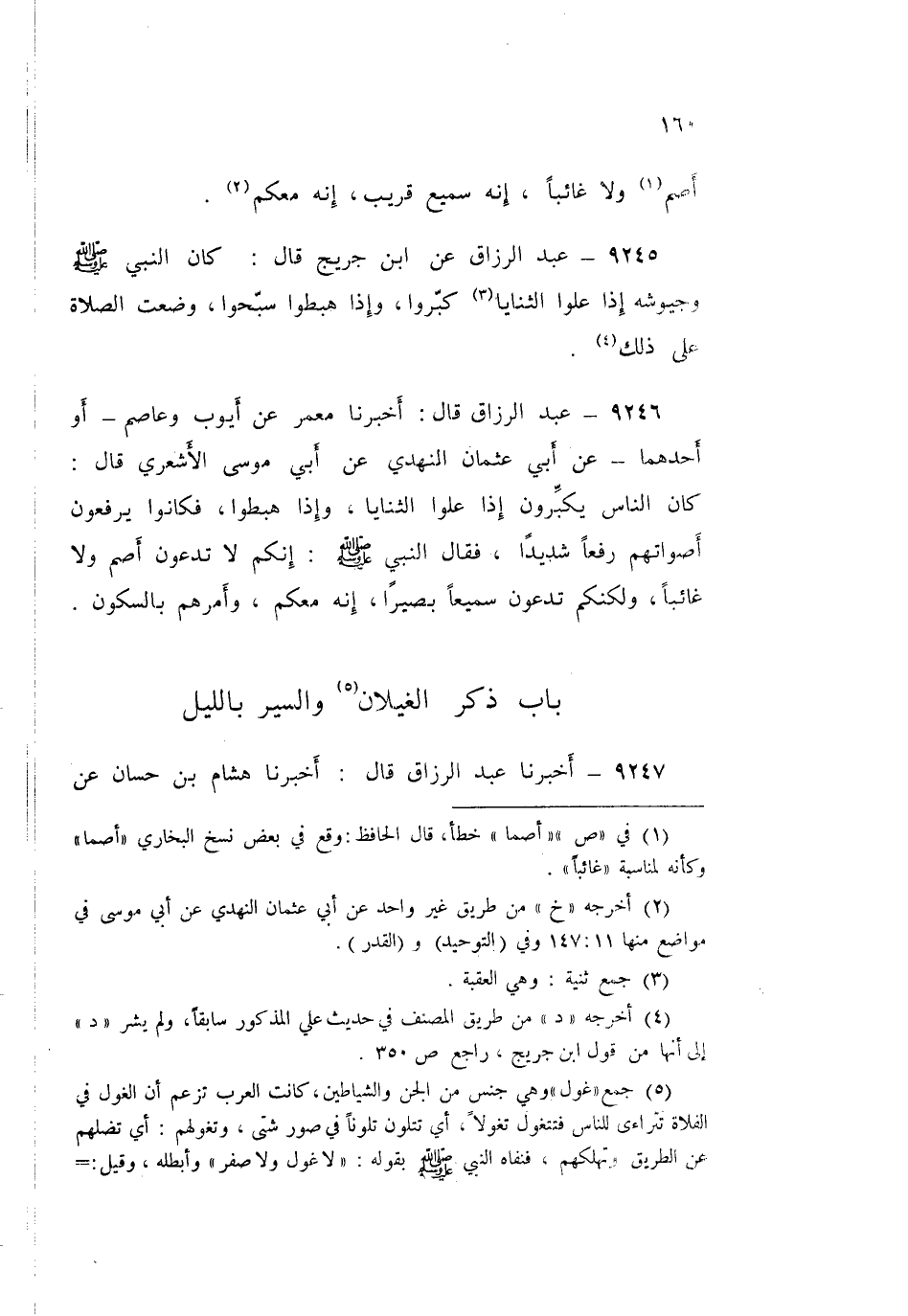 9246 - قَالَ: أَخْبَرَنَا مَعْمَرٌ، عَنْ أَيُّوبَ، وَعَاصِمٍ، أَوْ أَحَدِهِمَا عَنْ أَبِي عُثْمَانَ النَّهْدِيِّ، عَنْ أَبِي مُوسَى الْأَشْعَرِيِّ قَالَ: كَانَ النَّاسُ يُكَبِّرُونَ إِذَا عَلَوُا الثَّنَايَا وَإِذَا هَبَطُوا فَكَانُوا يَرْفَعُونَ أَصْوَاتَهُمْ رَفْعًا شَدِيدًا، فَقَالَ النَّبِيُّ صَلَّى اللهُ عَلَيْهِ وَسَلَّمَ: «§إِنَّكُمْ لَا تَدْعُونَ أَصَمَّ وَلَا غَائِبًا وَلَكِنَّكُمْ تَدْعُونَ سَمِيعًا بَصِيرًا، إِنَّهُ مَعَكُمْ، وَأَمَرَهُمْ بِالسُّكُونِ»