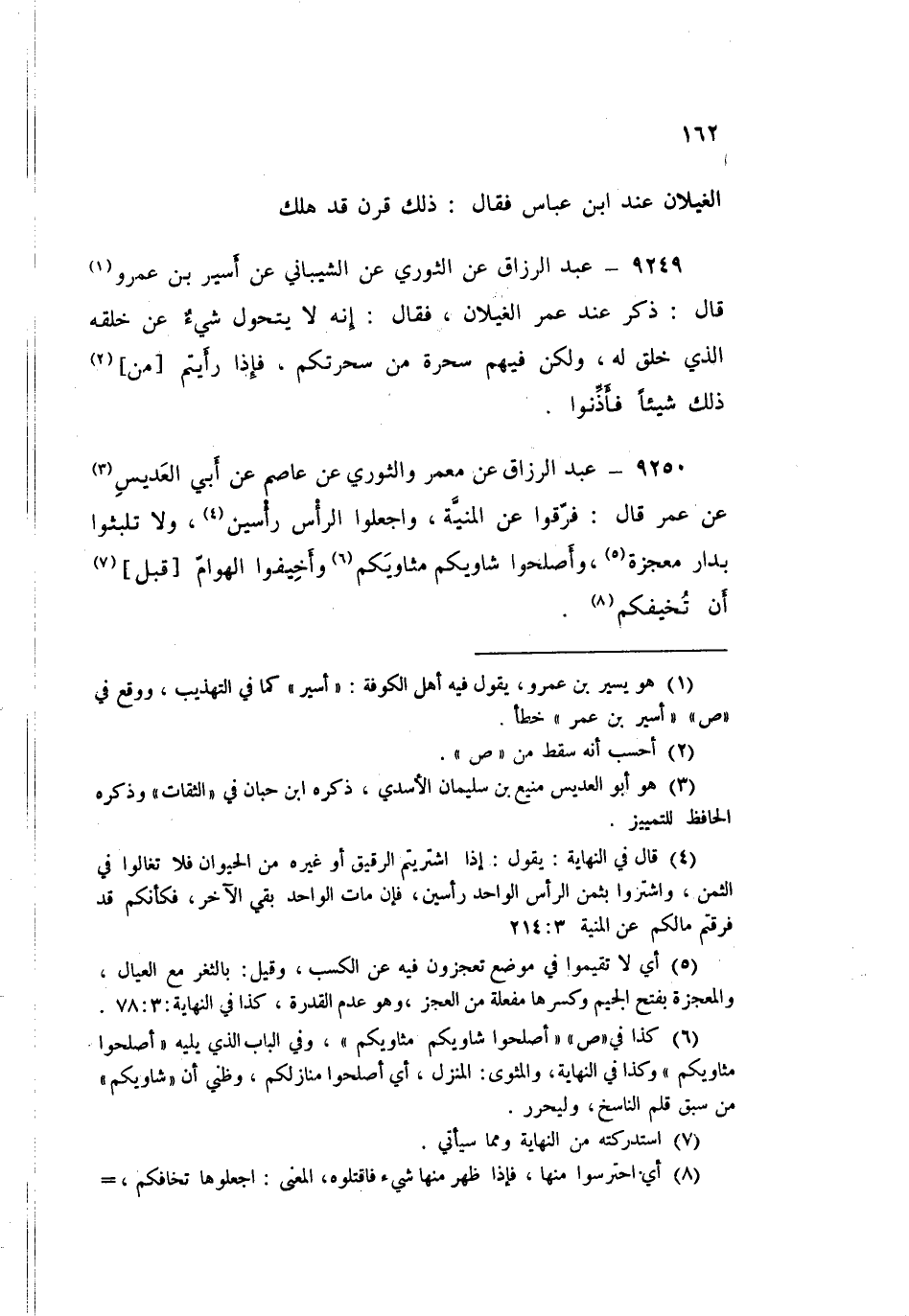 9250 - عَنْ مَعْمَرٍ، وَالثَّوْرِيِّ، عَنْ عَاصِمٍ، عَنْ أَبِي الْعُدَيْسِ، عَنْ عُمَرَ قَالَ: «§فَرِّقُوا عَنِ الْمَنِيَّةِ وَاجْعَلُوا الرَّأْسَ رَأْسَيْنِ، وَلَا تَلْبَثُوا بِدَارِ مَعْجَزَةٍ، وَأَصْلِحُوا شَاوِيَكُمْ مَثَاوِيَكُمْ وَأَخِيفُوا الْهَوَامَّ قَبْلَ أَنْ تُخِيفَكُمْ»