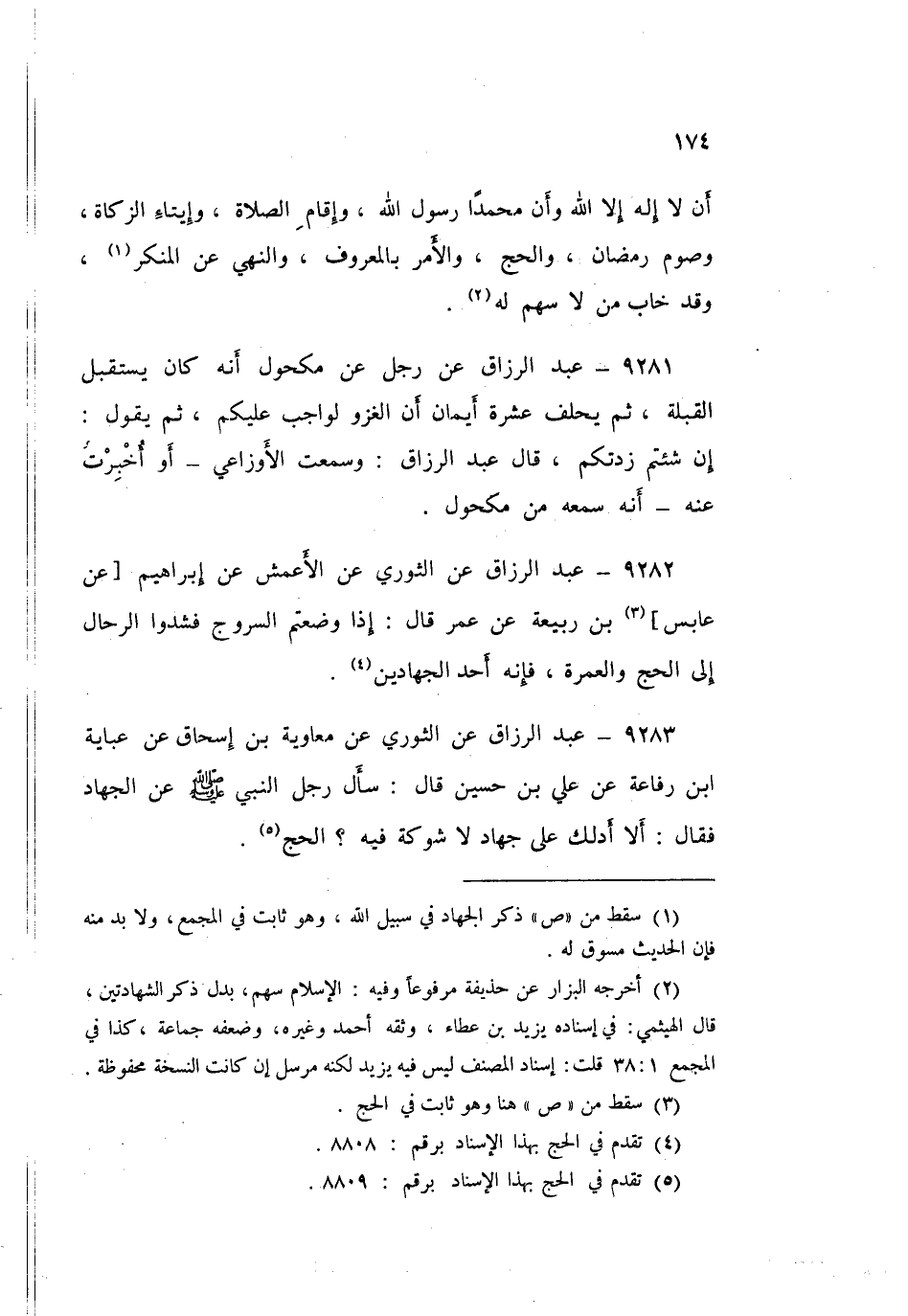 9283 - عَنِ الثَّوْرِيِّ، عَنْ مُعَاوِيَةَ بْنِ إِسْحَاقَ، عَنْ عَبَايَةَ بْنِ رِفَاعَةَ، عَنْ عَلِيِّ بْنِ حُسَيْنِ قَالَ: سَأَلَ رَجُلٌ النَّبِيٌّ صَلَّى اللهُ عَلَيْهِ وَسَلَّمَ عَنِ الْجِهَادِ، فَقَالَ: «§أَلَا أَدُلُّكَ عَلَى جِهَادٍ لَا شَوْكَةَ فِيهِ؟ الْحَجُّ»