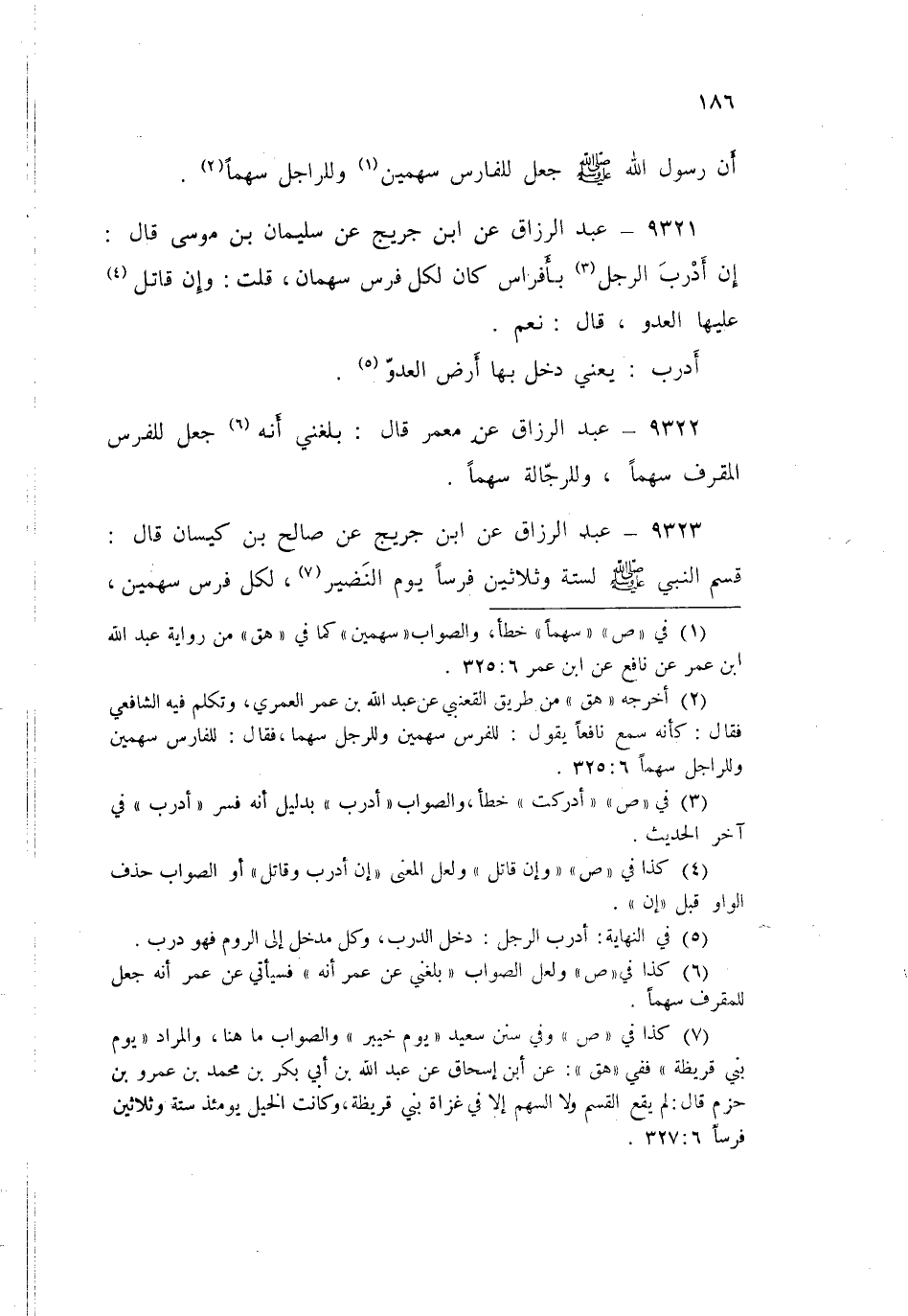 9323 - عَنِ ابْنِ جُرَيْجٍ، عَنْ صَالِحِ بْنِ كَيْسَانَ قَالَ: «§قَسَمَ النَّبِيُّ صَلَّى اللهُ عَلَيْهِ وَسَلَّمَ لِسِتَّةٍ وَثَلَاثِينَ فَرَسًا يَوْمَ النَّضِيرِ لِكُلِّ فَرَسٍ سَهْمَيْنِ، وَقَسَمَ يَوْمَ خَيْبَرٍ لِمِئَتَيْ فَرَسٍ، لِكُلِّ فَرَسٍ سَهْمَيْنِ» قُلْتُ: وَإِنْ قَاتَلَ