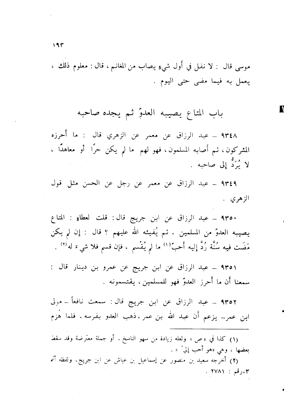 9348 - عَنْ مَعْمَرٍ، عَنِ الزُّهْرِيِّ قَالَ: «§مَا أَحْرَزَهُ الْمُشْرِكُونَ، ثُمَّ أَصَابَهُ الْمُسْلِمُونَ فَهُوَ لَهُمْ مَا لَمْ يَكُنْ حُرًّا، أَوْ مُعَاهِدًا لَا يُرَدُّ إِلَى صَاحِبِهِ»، عَبْدُ الرَّزَّاقِ،