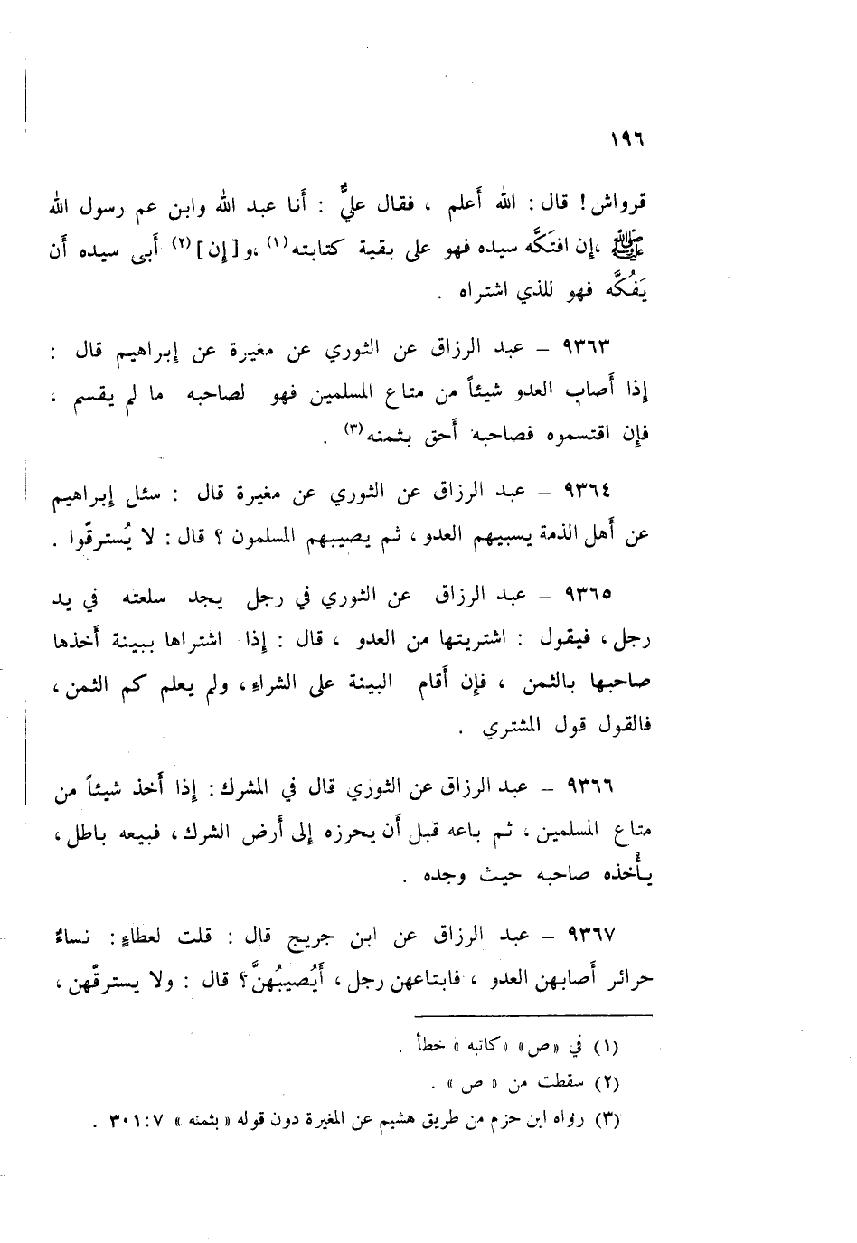 9366 - عَنِ الثَّوْرِيِّ قَالَ فِي الْمُشْرِكِ: «§إِذَا أَخَذَ شَيْئًا مِنْ مَتَاعِ الْمُسْلِمِينَ، ثُمَّ بَاعَهُ قَبْلَ أَنْ يُحْرِزَهُ إِلَى أَرْضِ الشِّرْكِ فَبَيْعُهُ بَاطِلٌ، يَأْخُذُهُ صَاحِبُهُ حَيْثُ وَجَدَهُ»