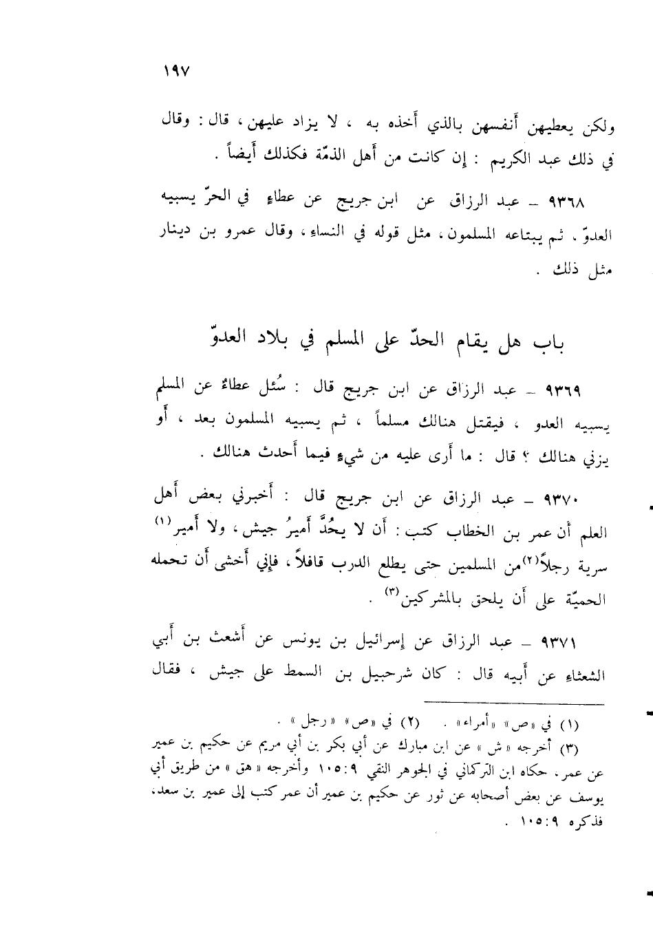 9369 - عَنِ ابْنِ جُرَيْجٍ قَالَ: سُئِلَ عَطَاءٌ، عَنِ الْمُسلِمِ يَسْبِيهِ الْعَدُوُّ فَيَقْتُلُ هُنَالِكَ مُسْلِمًا، ثُمَّ يَسْبِيهِ الْمُسْلِمُونَ بَعْدُ، أَوْ يَزْنِي هُنَالِكَ؟ قَالَ: «§مَا أَرَى عَلَيْهِ مِنْ شَيْءٍ فِيمَا أَحْدَثَ هُنَالِكَ»