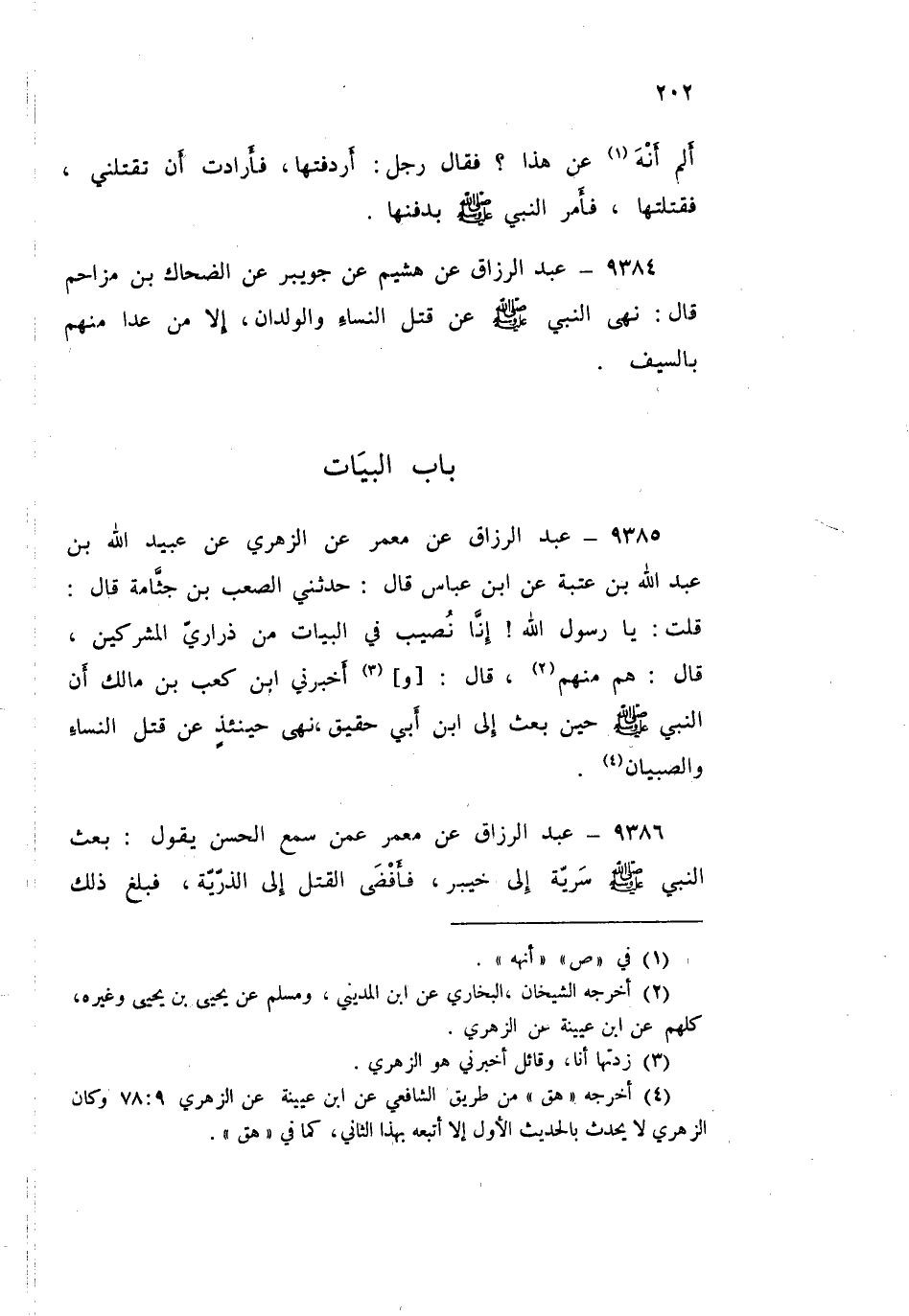 9385 - عَنْ مَعْمَرٍ، عَنِ الزُّهْرِيِّ، عَنْ عُبَيْدِ اللَّهِ بْنِ عَبْدِ اللَّهِ بْنِ عُتْبَةَ، عَنِ ابْنِ عَبَّاسٍ قَالَ: حَدَّثَنِي الصَّعْبُ بْنُ جُثَامَةَ قَالَ: قُلْتُ: يَا رَسُولَ اللَّهِ، إِنَّا §نُصِيبُ فِي الْبَيَاتِ مِنْ ذَرَارِي الْمُشْرِكِينَ قَالَ: «هُمْ مِنْهُمْ»
