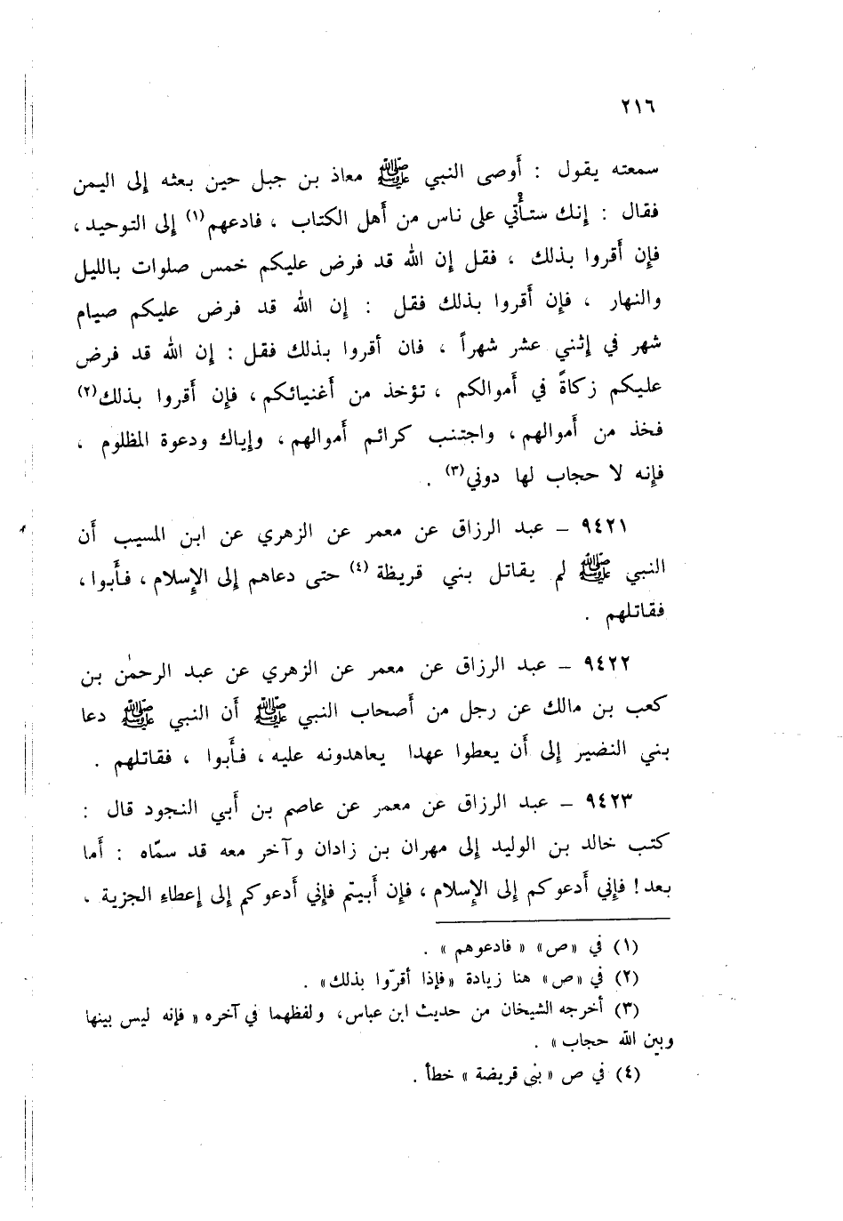 9421 - عَنْ مَعْمَرٍ، عَنِ الزُّهْرِيِّ، عَنِ ابْنِ الْمُسَيِّبِ: «أَنَّ النَّبِيَّ صَلَّى اللهُ عَلَيْهِ وَسَلَّمَ §لَمْ يُقَاتِلْ بَنِي قُرَيْظَةَ حَتَّى دَعَاهُمْ إِلَى الْإِسْلَامِ، فَأَبَوْا فَقَاتَلَهُمْ»