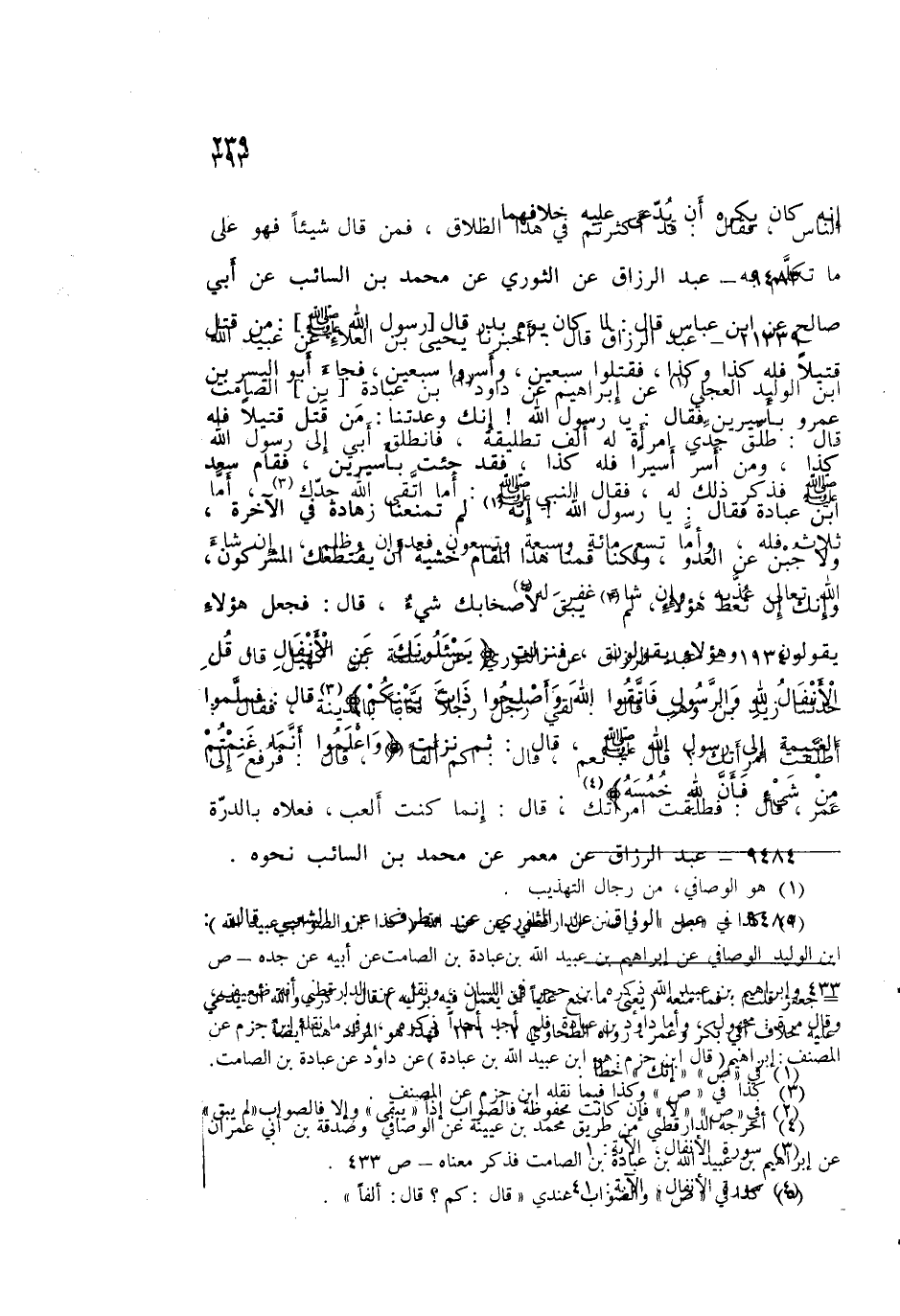 9483 - عَنِ الثَّوْرِيِّ، عَنْ مُحَمَّدِ بْنِ السَّائِبِ، عَنْ أَبِي صَالِحٍ، عَنِ ابْنِ عَبَّاسٍ قَالَ: لَمَّا كَانَ يَوْمُ بَدْرٍ، قَالَ رَسُولُ اللَّهِ صَلَّى اللهُ عَلَيْهِ وَسَلَّمَ: «§مَنْ قَتَلَ قَتِيلًا فَلَهُ كَذَا، وَكَذَا» فَقَتَلُوا سَبْعِينَ، وَأَسَرُوا سَبْعِينَ، فَجَاءَ أَبُو الْيَسَرِ بْنُ عَمْرُو بِأَسِيرَيْنِ فَقَالَ: يَا رَسُولَ اللَّهِ، إِنَّكَ وَعَدْتَنَا مَنْ قَتَلَ قَتِيلًا فَلَهُ كَذَا، وَمَنْ أَسَرَ أَسِيرًا فَلَهُ كَذَا، فَقَدْ جِئْتُ بِأَسِيرَيْنِ، فَقَامَ سَعْدُ بْنُ عُبَادَةَ فَقَالَ: يَا رَسُولَ اللَّهِ، إِنَّهُ لَمْ تَمْنَعْنَا زَهَادَةٌ فِي الْآخِرَةِ، وَلَا جُبْنٌ عَنِ الْعَدُوِّ، وَلَكِنَّا قُمْنَا هَذَا الْمَقَامَ خَشْيَةَ أَنْ يَقْتَطِعَكَ الْمُشْرِكُونَ، وَإِنَّكَ إِنْ تُعْطِ هَؤُلَاءِ لَمْ يَبْقَ لِأَصْحَابِكَ شَيْءٌ، قَالَ: فَجَعَلَ هَؤُلَاءِ يَقُولُونَ، وَهَؤُلَاءِ يَقُولُونَ فَنَزَلَتْ: {يَسْأَلُونَكَ عَنِ الْأَنْفَالِ قُلِ الْأَنْفَالُ لِلَّهِ وَالرَّسُولِ فَاتَّقُوا اللَّهَ وَأَصْلِحُوا ذَاتَ بَيْنِكُمْ} [الأنفال: 1] قَالَ: فَسَلَّمُوا الْغَنِيمَةَ إِلَى رَسُولِ اللَّهِ صَلَّى اللهُ عَلَيْهِ وَسَلَّمَ قَالَ: ثُمَّ نَزَلَتْ: {وَاعْلَمُوا أَنَّمَا غَنِمْتُمْ مِنْ شَيْءٍ فَأَنَّ لِلَّهِ خُمُسَهُ} [الأنفال: 41] " عَبْدُ الرَّزَّاقِ،