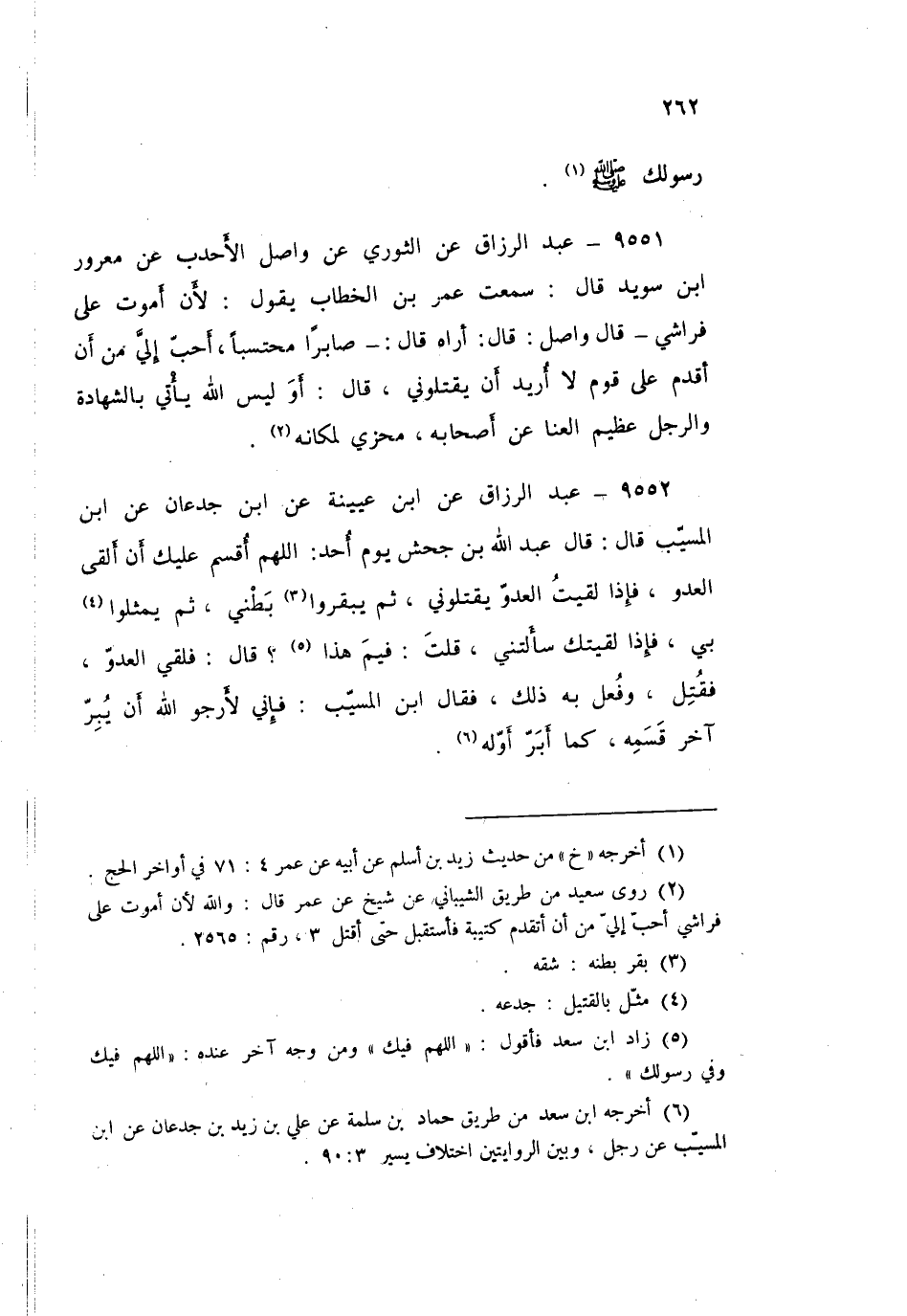 9552 - عَنِ ابْنِ عُيَيْنَةَ، عَنِ ابْنِ جُدْعَانَ، عَنِ ابْنِ الْمُسَيِّبِ قَالَ: قَالَ عَبْدُ اللَّهِ بْنُ جَحْشٍ يَوْمَ أُحُدٍ: " §اللَّهُمَّ أُقْسِمُ عَلَيْكَ أَنْ أَلْقَى الْعَدُوَّ، فَإِذَا لَقِيتُ الْعَدُوَّ يَقْتُلُونِي، ثُمَّ يَبْقُرُوا بَطْنِي، ثُمَّ يُمَثِّلُوا بِي، فَإِذَا لَقِيتُكَ سَأَلْتَنِي قُلْتَ: فِيمَ هَذَا؟ " قَالَ: فَلَقِيَ الْعَدُوَّ فَقُتِلَ، وَفُعِلَ بِهِ ذَلِكَ فَقَالَ ابْنُ الْمُسَيِّبِ: «فَإِنِّي لَأَرْجُو اللَّهَ أَنْ يُبِرَّ آخِرَ قَسَمِهِ كَمَا أَبَرَّ أَوْلَهُ»