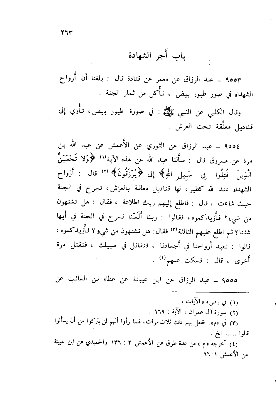 9553 - عَنْ مَعْمَرٍ، عَنْ قَتَادَةَ قَالَ: بَلَغَنَا أَنَّ §أَرْوَاحَ الشُّهَدَاءِ فِي صُوَرِ طُيُورٍ بِيضٍ، تَأْكُلُ مِنْ ثِمَارِ الْجَنَّةِ " وَقَالَ الْكَلْبِيُّ، عَنِ النَّبِيِّ صَلَّى اللهُ عَلَيْهِ وَسَلَّمَ: «فِي صُورَةِ طُيُورٍ بِيضٍ تَأْوِي إِلَى قَنَادِيلَ مُعَلَّقَةٍ تَحْتَ الْعَرْشِ»