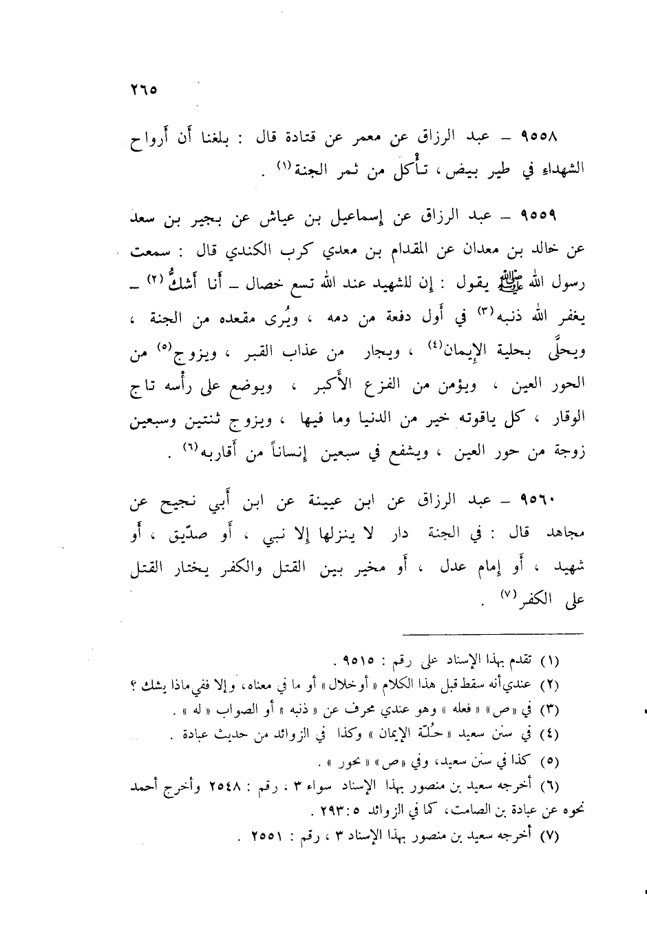 9559 - عَنْ إِسْمَاعِيلَ بْنِ عَيَّاشٍ، عَنْ بَحِيرِ بْنِ سَعْدٍٍ، عَنْ خَالِدِ بْنِ مَعْدَانَ، عَنِ الْمِقْدَامِ بْنِ مَعْدِي كَرِبَ الْكِنْدِيِّ قَالَ: سَمِعْتُ رَسُولَ اللَّهِ صَلَّى اللهُ عَلَيْهِ وَسَلَّمَ يَقُولُ: «إِنَّ §لِلشَّهِيدِ عِنْدَ اللَّهِ تِسْعَ خِصَالٍ - أَنَا أَشُكُّ - يَغْفِرُ اللَّهُ ذَنْبَهُ فِي أَوَّلِ دُفْعَةٍ مِنْ دَمِهِ، ويُرَى مِقْعَدُهُ مِنَ الْجَنَّةِ، وَيُحَلَّى بِحِلْيَةِ الْإِيمَانِ، وَيُجَارُ مِنْ عَذَابِ الْقَبْرِ، وَيُزَوَّجُ مِنَ الْحُورِ الْعِينِ، وَيُؤَمَّنُ مِنَ الْفَزَعِ الْأَكْبَرِ، وَيُوضَعُ عَلَى رَأْسِهِ تَاجُ الْوَقَارِ، كُلُّ يَاقُوتَةٍ خَيْرٌ مِنَ الدُّنْيَا وَمَا فِيهَا، وَيُزَوَّجُ ثِنْتَيْنِ وَسَبْعِينَ زَوْجَةً مِنْ حُورِ الْعِينِ، وَيَشْفَعُ فِي سَبْعِينَ إِنْسَانًا مِنْ أَقَارِبِهِ»