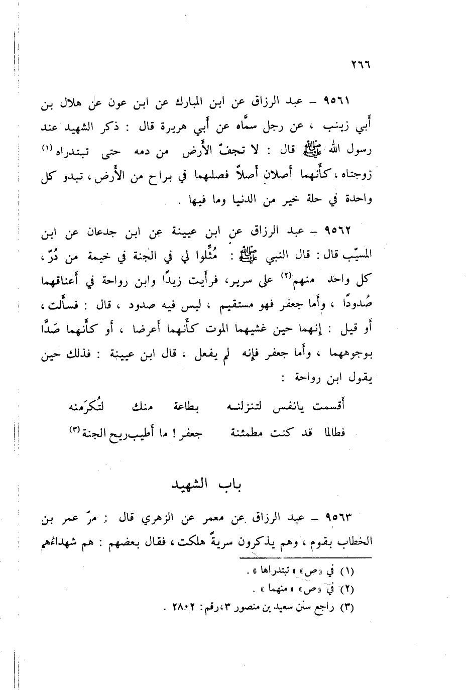 9562 - عَنِ ابْنِ عُيَيْنَةَ، عَنِ ابْنِ جُدْعَانَ، عَنِ ابْنِ الْمُسَيِّبِ قَالَ: قَالَ النَّبِيُّ صَلَّى اللهُ عَلَيْهِ وَسَلَّمَ: «§مُثَّلُوا لِي فِي الْجَنَّةِ فِي خَيْمَةٍ مِنْ دُرٍّ كُلُّ وَاحِدٍ مِنْهُمْ عَلَى سَرِيرٍ» فَرَأَيْتُ زَيْدًا وَابْنَ رَوَاحَةَ فِي أَعْنَاقِهِمَا صُدُودًا، وَأَمَّا جَعْفَرٌ فَهُوَ مُسْتَقِيمٌ لَيْسَ فِيهِ صُدُودٌ قَالَ: فَسَأَلْتُ، أَوْ قِيلَ: إِنَّهُمَا حِينَ غَشِيَهُمَا الْمَوْتُ كَأَنَّهُمَا أَعْرَضَا، أَوْ كَأَنَّهُمَا صَدَّا بِوُجُوهِهِمَا، وَأَمَّا جَعْفَرٌ فَإِنَّهُ لَمْ يَفْعَلْ "، قَالَ ابْنُ عُيَيْنَةَ فَذَلِكَ حِينَ يَقُولُ ابْنُ رَوَاحَةَ: «