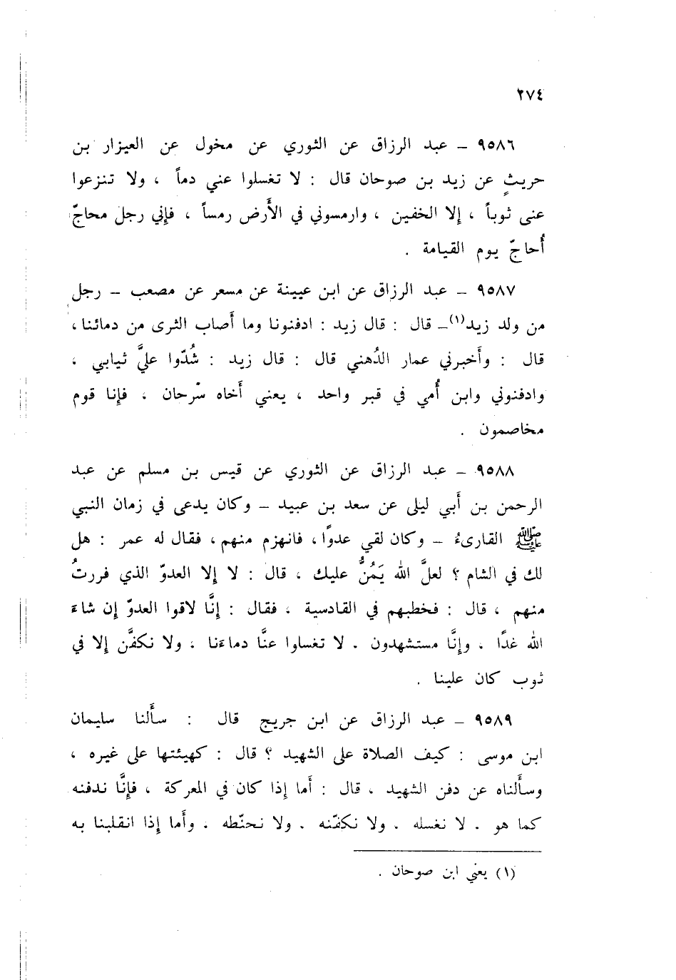 9589 - عَنِ ابْنِ جُرَيْجٍ قَالَ: سَأَلْنَا سُلَيْمَانَ بْنَ مُوسَى: كَيْفَ §الصَّلَاةُ عَلَى الشَّهِيدِ؟ قَالَ: «كَهَيْئَتِهَا عَلَى غَيْرِهِ» وَسَأَلْنَاهُ عَنْ دَفْنِ الشَّهِيدِ قَالَ: «أَمَّا إِذَا كَانَ فِي المَعْرَكَةٍ فَإِنَّا نَدْفِنُهُ كَمَا هُوَ لَا نُغَسِّلُهُ، وَلَا نُكَفِّنُهُ، وَلَا نُحَنِّطُهُ، وَأَمَّا إِذَا انْقَلَبْنَا بِهِ وَبِهِ رَمَقٌ، فَإِنَّا نُغَسِّلُهُ، وَنُكَفِّنُهُ، وَنُحَنِّطُهُ، وَجَدْنَا النَّاسَ عَلَى ذَلِكَ، وَكَانَ عَلَيْهِ مَنْ مَضَى قَبْلَنَا مِنَ النَّاسِ»