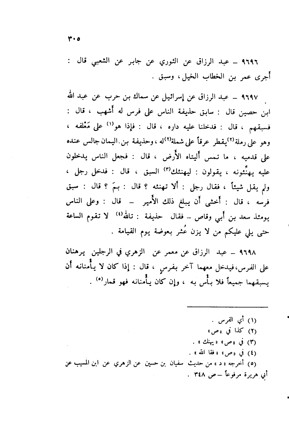9697 - عَنِ اسْرَائِيلَ، عَنْ سِمَاكِ بْنِ حَرْبٍ، عَنْ عَبْدِ اللَّهِ بْنِ حُصَيْنٍ قَالَ: سَابَقَ حُذَيْفَةُ النَّاسَ عَلَى فَرَسٍ لَهُ أَشْهَبَ قَالَ: فَسَبَقَهُمْ قَالَ: فَدَخَلْنَا عَلَيْهِ دَارَهُ قَالَ: فَإِذَا هُوَ عَلَى مَعْلَفِهِ، وَهُوَ عَلَى رَمْلَةٍ، يَقْطُرُ عَرَقًا عَلَى شَمْلَةٍ لَهُ، وَحُذَيْفَةُ بْنُ الْيَمَانِ جَالِسٌ عِنْدَهُ عَلَى قَدَمَيْهِ، مَا تَمَسُّ أَلْيَتَاهُ الْأَرْضَ قَالَ: فَجَعَلَ النَّاسَ يَدْخُلُونَ عَلَيْهِ يُهَنِّئُونَهُ وَيَقُولُونَ: لِيَهْنَأْكَ السَّبْقُ قَالَ: فَدَخَلَ رَجُلٌ، وَلَمْ يَقُلْ شَيْئًا فَقَالَ رَجُلٌ: أَلَا تُهَنِّئُهُ؟ قَالَ: بِمَ؟ قَالَ: سَبَقَ فَرَسُهُ قَالَ: أَخْشَى أَنْ يَبْلُغَ ذَلِكَ الْأَمِيرَ قَالَ: وَعَلَى النَّاسِ يَوْمَئِذٍ سَعْدُ بْنُ أَبِي وَقَّاصٍ، فَقَالَ حُذَيْفَةُ: «تَاللَّهِ §لَا تَقُومُ السَّاعَةُ حَتَّى يَلِيَ عَلَيْكُمْ مَنْ لَا يَزِنُ عُشْرَ بَعُوضَةٍ يَوْمَ الْقِيَامَةِ»