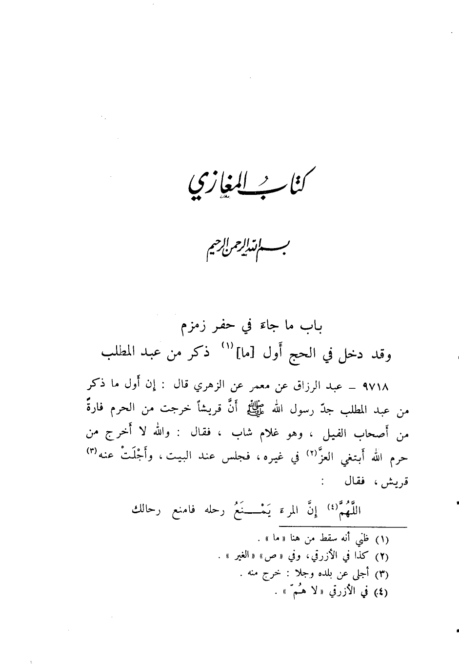 9718 - عَنْ مَعْمَرٍ، عَنِ الزُّهْرِيِّ قَالَ: " إِنَّ §أَوَّلَ مَا ذُكِرَ مِنْ عَبْدِ الْمُطَّلِبِ جَدِّ الرَّسُولِ صَلَّى اللهُ عَلَيْهِ وَسَلَّمَ أَنَّ قُرَيْشًا خَرَجَتْ مِنَ الْحَرَمِ فَارَّةً مِنْ أَصْحَابِ الْفِيلِ، وَهُوَ غُلَامٌ شَابٌّ فَقَالَ: وَاللَّهِ لَا أَخْرُجُ مِنْ حَرَمِ اللَّهِ أَبْتَغِي الْعِزَّ فِي غَيْرِهِ، فَجَلَسَ عِنْدَ الْبَيْتِ، وَأَجْلَتْ عَنْهُ قُرَيْشٌ فَقَالَ: