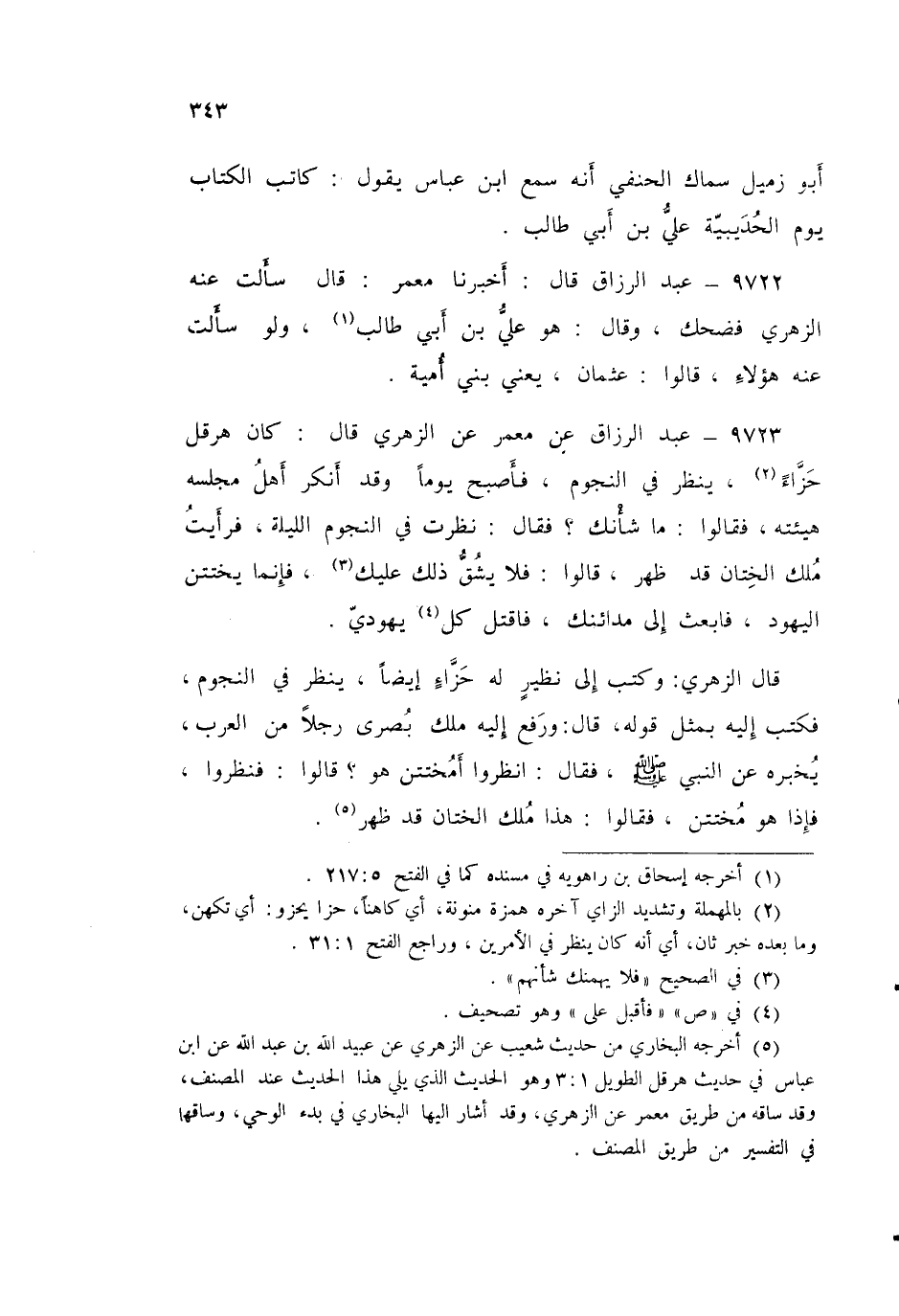9723 - عَنْ مَعْمَرٍ، عَنِ الزُّهْرِيِّ قَالَ: §كَانَ هِرَقْلُ حَزَّاءً يَنْظُرُ فِي النُّجُومِ، فَأَصْبَحَ يَوْمًا وَقَدْ أَنْكَرَ أَهْلُ مَجْلِسِهِ هَيْئَتَهُ فَقَالُوا: مَا شَأْنُكَ؟ فَقَالَ: نَظَرْتُ فِي النُّجُومِ اللَّيْلَةَ فَرَأَيْتُ مَلَكَ الْخِتَانِ قَدْ ظَهَرَ قَالُوا: فَلَا يَشُقُّ ذَلِكَ عَلَيْكَ، فَإِنَّمَا يَخْتَتِنُ الْيَهُودُ، فَابْعَثْ إِلَى مَدَائِنِكَ فَاقْتُلْ كُلَّ يَهُودِيٍّ قَالَ الزُّهْرِيُّ: وَكَتَبَ إِلَى نَظِيرٍ لَهُ حَزَّاءٍ أَيْضًا، يَنْظُرُ فِي النُّجُومِ، فَكَتَبَ إِلَيْهِ بِمِثْلِ قَوْلِهِ قَالَ: وَرَفَعَ إِلَيْهِ مَلِكُ بُصْرَى رَجُلًا مِنَ الْعَرَبِ يُخْبِرُهُ عَنِ النَّبِيِّ صَلَّى اللهُ عَلَيْهِ وَسَلَّمَ فَقَالَ: «انْظُرُوا أَمُخْتَتِنٌ هُوَ؟» قَالُوا: فَنَظَرُوا فَإِذَا هُوَ مُخْتَتِنٌ فَقَالُوا: هَذَا مَلَكُ الْخِتَانِ قَدْ ظَهَرَ