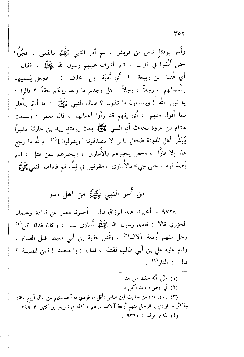 9728 - عَبْدُ الرَّزَّاقِ، قَالَ: أَخْبَرَنَا مَعْمَرٌ، عَنْ قَتَادَةَ، وَعُثْمَانَ الْجَزَرِيِّ قَالَا: فَادَى رَسُولُ اللَّهِ صَلَّى اللهُ عَلَيْهِ وَسَلَّمَ أُسَارَى بَدْرٍ، وَكَانَ فِدَاءُ كُلِّ رَجُلٍ مِنْهُمْ أَرْبَعَةَ آلَافٍ، وَقُتِلَ عُقْبَةُ بْنُ أَبِي مُعَيْطٍ قَبْلَ الْفِدَاءِ، وَقَامَ عَلَيْهِ عَلِيُّ بْنُ أَبِي طَالِبٍ فَقَتَلَهُ فَقَالَ: يَا مُحَمَّدُ فَمَنْ لِلصِّبْيَةِ؟ قَالَ: «§النَّارُ»