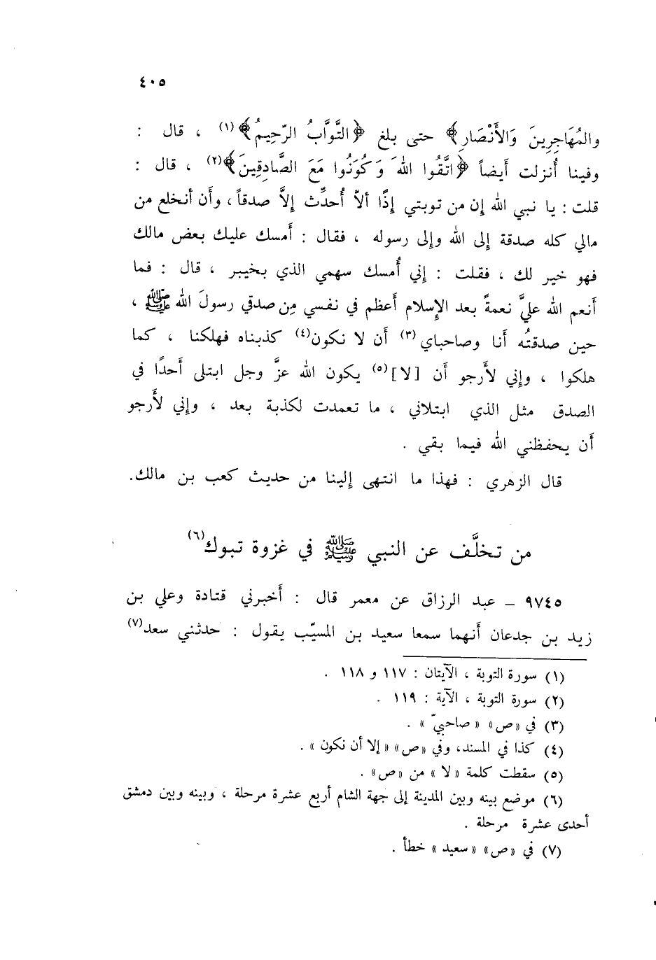 9745 - عَنْ مَعْمَرٍ قَالَ: أَخْبَرَنِي قَتَادَةُ، وَعَلِيُّ بْنُ زَيْدِ بْنِ جُدْعَانَ، أَنَّهُمَا سَمِعَا سَعِيدَ بْنَ الْمُسَيِّبِ يَقُولُ: حَدَّثَنِي سَعْدُ -[406]- بْنُ أَبِي وَقَّاصٍ: أَنَّ رَسُولَ اللَّهِ صَلَّى اللهُ عَلَيْهِ وَسَلَّمَ لَمَّا خَرَجَ إِلَى تَبُوكَ اسْتَخْلَفَ عَلَيْنَا إِلَى الْمَدِينَةِ عَلِيُّ بْنُ أَبِي طَالِبٍ فَقَالَ: يَا رَسُولَ اللَّهِ مَا كُنْتُ أُحِبُّ أَنْ تَخْرُجَ وَجْهًا إِلَّا وَأَنَا مَعَكَ، فَقَالَ: «§أَمَا تَرْضَى أَنْ تَكُونَ مِنِّي بِمَنْزِلَةِ هَارُونَ مِنْ مُوسَى غَيْرَ أَنَّهُ لَا نَبِيَّ بَعْدِي»، قَالَ مَعْمَرٌ: فَأَخْبَرَنِي الزُّهْرِيُّ قَالَ: كَانَ أَبُو لُبَابَةَ مِمَّنْ تَخَلَّفَ عَنْ رَسُولِ اللَّهِ صَلَّى اللهُ عَلَيْهِ وَسَلَّمَ فِي غَزْوَةِ تَبُوكَ فَرَبَطَ نَفْسَهُ بِسَارِيَةٍ، ثُمَّ قَالَ: وَاللَّهِ لَا أَحُلُّ نَفْسِي مِنْهَا، وَلَا أَذُوقُ طَعَامًا وَلَا شَرَابًا حَتَّى أَمُوتَ أَوْ يَتُوبَ اللَّهُ عَلَيَّ، فَمَكَثَ سَبْعَةَ أَيَّامٍ لَا يَذُوقُ فِيهَا طَعَامًا وَلَا شَرَابًا، حَتَّى كَانَ يَخِرُّ مَغْشِيًّا عَلَيْهِ قَالَ: ثُمَّ تَابَ اللَّهُ عَلَيْهِ فَقِيلَ لَهُ قَدْ تِيبَ عَلَيْكَ يَا أَبَا لُبَابَةَ فَقَالَ: وَاللَّهِ لَا أَحُلُّ نَفْسِي حَتَّى يَكُونَ رَسُولُ اللَّهِ صَلَّى اللهُ عَلَيْهِ وَسَلَّمَ يَحُلُّنِي بِيَدِهِ قَالَ فَجَاءَ النَّبِيُّ صَلَّى اللهُ عَلَيْهِ وَسَلَّمَ فَحَلَّهُ بِيَدِهِ ثُمَّ قَالَ أَبُو لُبَابَةَ: يَا رَسُولَ اللَّهِ إِنَّ مِنْ تَوْبَتِي أَنْ أَهْجُرَ دَارَ قَوْمِي الَّتِي أَصَبْتُ فِيهَا الذَّنْبَ وَأَنْ أَنْخَلِعَ مِنْ مَالِي كُلِّهِ صَدَقَةً إِلَى اللَّهِ وَإِلَى رَسُولِهِ قَالَ: «يُجْزِيكَ الثُّلُثَ يَا أَبَا لُبَابَةَ»