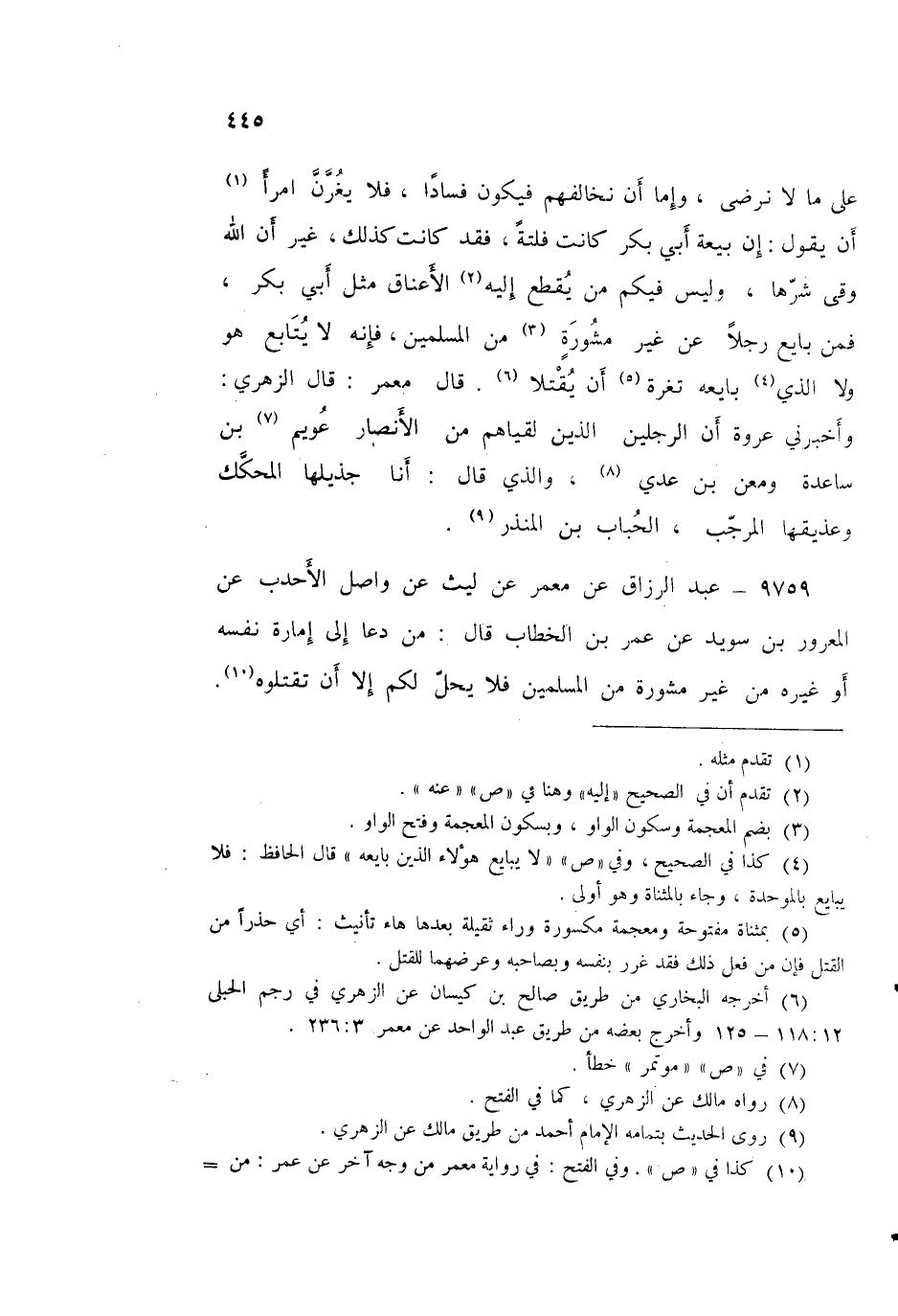 9759 - عَنْ مَعْمَرٍ، عَنْ لَيْثٍ، عَنْ وَاصِلٍ الْأَحْدَبِ، عَنِ الْمَعْرُورِ بْنِ سُوَيْدٍ، عَنْ عُمَرَ بْنِ الْخَطَّابِ قَالَ: «§مَنْ دَعَا إِلَى إِمَارَةِ نَفْسِهِ، أَوْ غَيْرِهِ مِنْ غَيْرِ مَشُورَةٍ مِنَ الْمُسْلِمِينَ فَلَا يَحِلُّ لَكُمْ إِلَّا أَنْ تَقْتُلُوهُ»