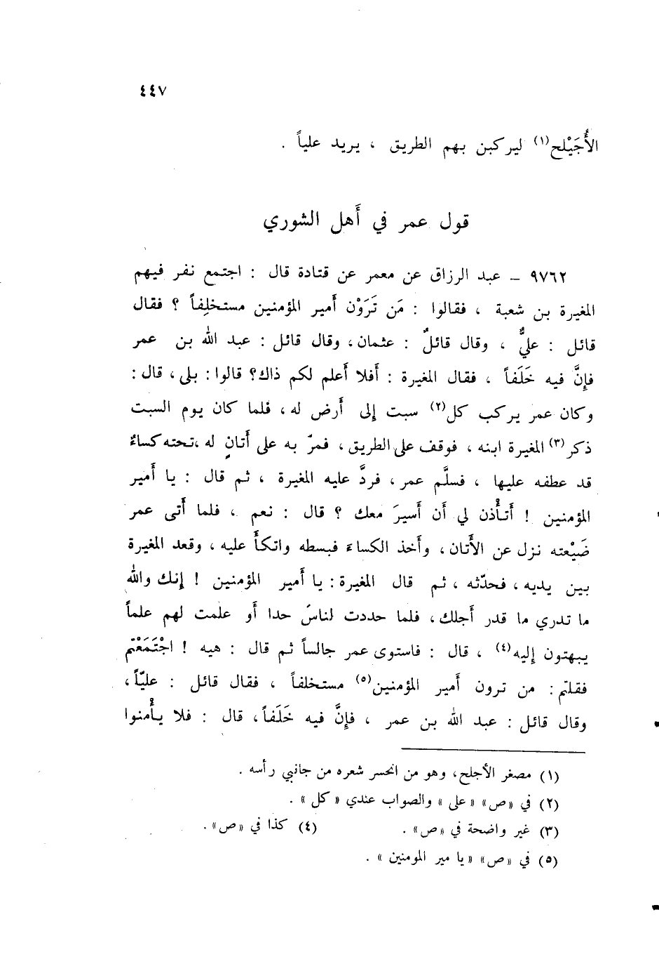 9762 - عَنْ مَعْمَرٍ، عَنْ قَتَادَةَ قَالَ: اجْتَمَعَ نَفَرٌ فِيهِمُ الْمُغِيرَةُ بْنُ شُعْبَةَ فَقَالُوا: مَنْ تَرَوْنَ أَمِيرُ الْمُؤْمِنِينَ مُسْتَخْلِفًا؟ فَقَالَ قَائِلٌ: عَلِيٌّ، وَقَالَ قَائِلٌ: عُثْمَانُ، وَقَالَ قَائِلٌ: عَبْدُ اللَّهِ بْنُ عُمَرَ فَإِنَّ فِيهِ خَلَفًا، فَقَالَ الْمُغِيرَةُ: أَفَلَا أَعْلَمُ لَكُمْ ذَاكَ؟ قَالُوا: بَلَى قَالَ: وَكَانَ عُمَرُ يَرْكَبُ كُلَّ سَبْتٍ إِلَى أَرْضٍ لَهُ، فَلَمَّا كَانَ يَوْمَ السَّبْتِ ذَكَرَ الْمُغِيرَةُ ابْنَهُ، فَوَقَفَ عَلَى الطَّرِيقِ فَمَرَّ بِهِ عَلَى أَتَانٍ لَهُ تَحْتَهُ كِسَاءٌ قَدْ عَطَفَهُ عَلَيْهَا، فَسَلَّمَ عُمَرُ فَرَدَّ عَلَيْهِ الْمُغِيرَةُ، ثُمَّ قَالَ: يَا أَمِيرَ الْمُؤْمِنِينَ أَتَأْذَنُ لِي أَنْ أَسِيرَ مَعَكَ؟ قَالَ: نَعَمْ، فَلَمَّا أَتَى عُمَرُ ضَيْعَتَهُ نَزَلَ عَنِ الْأَتَانِ وَأَخَذَ الْكِسَاءَ فَبَسَطَهُ وَاتَّكَأَ عَلَيْهِ، وَقَعَدَ الْمُغِيرَةُ بَيْنَ يَدَيْهِ فَحَدَّثَهُ، ثُمَّ قَالَ الْمُغِيرَةُ: يَا أَمِيرَ الْمُؤْمِنِينَ إِنَّكَ وَاللَّهِ مَا تَدْرِي مَا قَدْرُ أَجَلِكَ، فَمَا حَدَدْتَ لِنَاسٍ حَدًّا، أَوْ عَلَّمْتَ لَهُمْ عَلَمًا يَبْهَتُونَ إِلَيْهِ قَالَ: فَاسْتَوَى عُمَرُ جَالِسًا، ثُمَّ قَالَ: " هِيهْ اجْتَمَعْتُمْ فَقُلْتُمْ: مَنْ تَرَوْنَ أَمِيرُ الْمُؤْمِنِينَ مُسْتَخْلِفًا؟ فَقَالَ قَائِلٌ: عَلِيٌّ، وَقَالَ قَائِلٌ: عَبْدُ اللَّهِ بْنُ عُمَرَ فَإِنَّ فِيهِ خَلَفًا قَالَ: فَلَا يَأْمَنُوا -[448]- يُسْأَلُ عَنْهَا رَجُلَانِ مِنْ آلِ عُمَرَ " فَقُلْتُ: أَنَا لَا أَعْلَمُ لَكَ ذَلِكَ قَالَ: قُلْتُ: «فَاسْتَخْلِفْ» قَالَ: «مَنْ؟» قُلْتُ: عُثْمَانُ قَالَ: «§أَخْشَى عَقْدَهُ وَأَثَرَتَهُ» قَالَ: قُلْتُ: عَبْدُ الرَّحْمَنِ بْنُ عَوْفٍ قَالَ: «مُؤْمِنٌ ضَعِيفٌ» قَالَ: قُلْتُ: فَالزُّبَيْرُ قَالَ: «ضَرِسٌ» قَالَ: قُلْتُ: طَلْحَةُ بْنُ عُبَيْدِ اللَّهِ قَالَ: «رِضَاؤُهُ رِضَاءُ مُؤْمِنٍ وَغَضَبُهُ غَضَبُ كَافِرٍ أَمَا إِنِّي لَوْ وَلَّيْتُهَا إِيَّاهُ لَجَعَلَ خَاتَمَهُ فِي يَدِ امْرَأَتِهِ» قَالَ: قُلْتُ: فَعَلِيٌّ قَالَ: «أَمَا إِنَّهُ أَحْرَاهُمْ إِنْ كَانَ أَنْ يُقِيمَهُمْ عَلَى سُنَّةِ نَبِيِّهِمْ صَلَّى اللهُ عَلَيْهِ وَسَلَّمَ، وَقَدْ كُنَّا نَعِيبُ عَلَيْهِ مُزَاحَةً كَانَتْ فِيهِ»