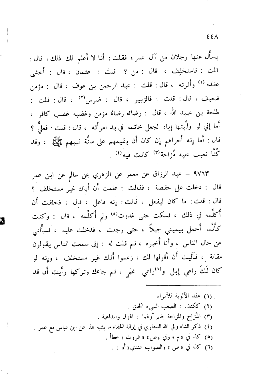 9763 - عَنْ مَعْمَرٍ، عَنِ الزُّهْرِيِّ، عَنْ سَالِمٍ، عَنِ ابْنِ عُمَرَ قَالَ: دَخَلْتُ عَلَى حَفْصَةَ، فَقَالَتْ: عَلِمْتَ أَنَّ أَبَاكَ غَيْرُ مُسْتَخْلِفٍ؟ قَالَ: قُلْتُ: «مَا كَانَ لِيَفْعَلَ» قَالَتْ: إِنَّهُ فَاعِلٌ قَالَ: " §فَحَلَفْتُ أَنْ أُكَلِّمَهُ فِي ذَلِكَ، فَسَكَتُّ حَتَّى غَدَوْتُ وَلَمْ أُكَلِّمْهُ قَالَ: وَكُنْتُ كَأَنَّمَا أَحْمِلُ بِيَمِينِي جَبَلًا حَتَّى رَجَعْتُ فَدَخَلْتُ عَلَيْهِ، فَسَأَلَنِي عَنْ حَالِ النَّاسِ وَأَنَا أُخْبِرُهُ، ثُمَّ قُلْتُ لَهُ: إِنِّي سَمِعْتُ النَّاسَ يَقُولُونَ مَقَالَةً فَآلَيْتُ أَنْ أَقُولَهَا لَكَ، زَعَمُوا أَنَّكَ غَيْرُ مُسْتَخْلِفٍ، وَإِنَّهُ لَوْ كَانَ لَكَ رَاعِي إِبِلٍ وَرَاعِي غَنَمٍ، ثُمَّ جَاءَكَ وَتَرَكَهَا رَأَيْتَ أَنْ قَدْ -[449]- ضَيَّعَ؟ فَرِعَايَةُ النَّاسِ أَشَدُّ قَالَ: فَوَافَقَهُ قُولِي، فَوَضَعَ رَأْسَهُ سَاعَةً، ثُمَّ رَفَعَهُ إِلَيَّ " فَقَالَ: إِنَّ اللَّهَ يَحْفَظُ دِينَهُ، وَإِنِّي إِنْ لَا أَسْتَخْلِفْ فَإِنَّ رَسُولَ اللَّهِ صَلَّى اللهُ عَلَيْهِ وَسَلَّمَ لَمْ يَسْتَخْلِفْ، وَإِنْ أَسْتَخْلِفْ فَإِنَّ أَبَا بَكْرٍ قَدِ اسْتَخْلَفَ قَالَ: فمَا هُوَ إِلَّا أَنْ ذَكَرَ رَسُولَ اللَّهِ صَلَّى اللهُ عَلَيْهِ وَسَلَّمَ وَأَبَا بَكْرٍ فَعَلِمْتُ أَنَّهُ لَمْ يَكُنْ لِيَعْدِلَ بِرَسُولِ اللَّهِ صَلَّى اللهُ عَلَيْهِ وَسَلَّمَ، وَأَنَّهُ غَيْرُ مُسْتَخْلِفٍ "