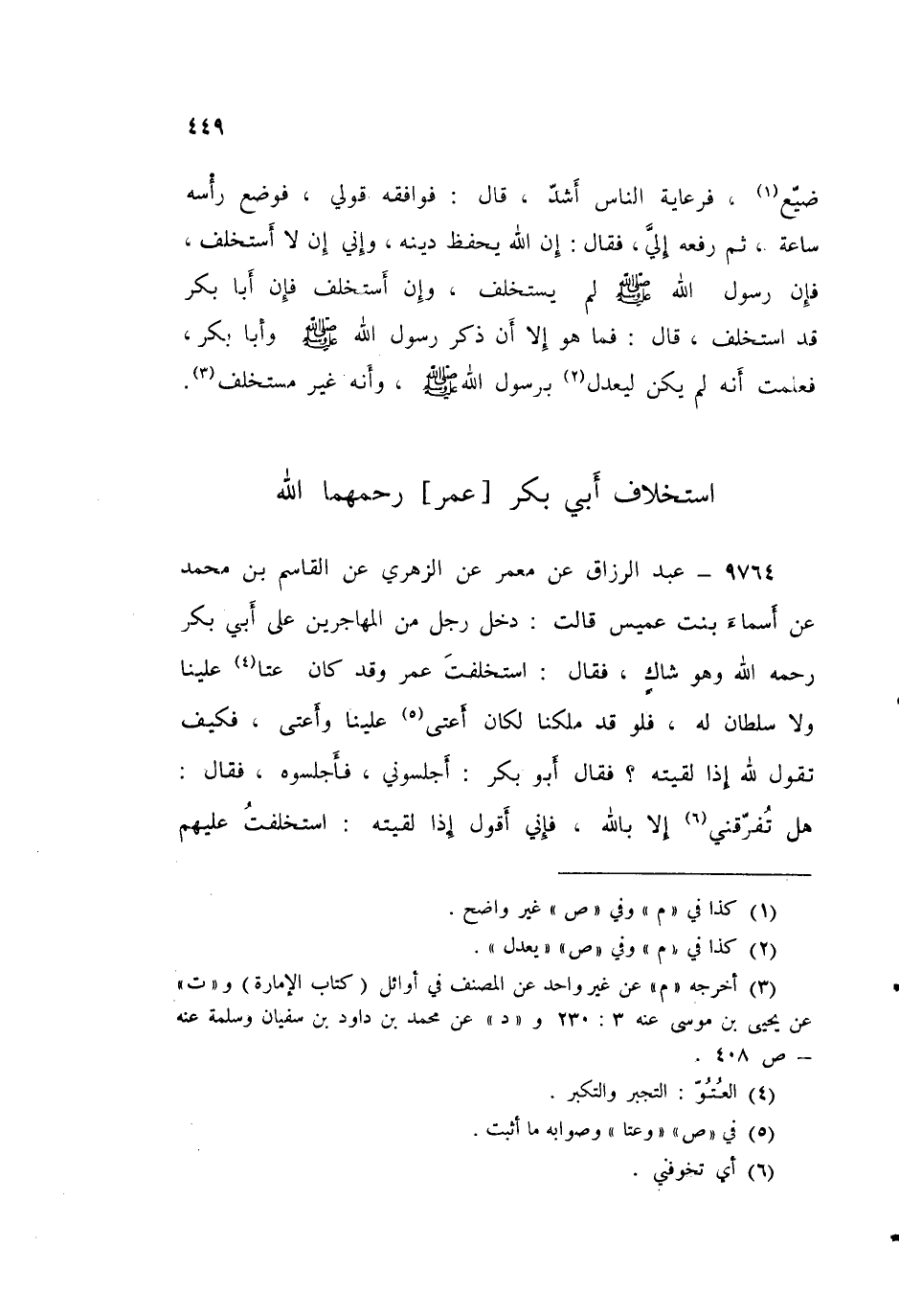 9764 - عَنْ مَعْمَرٍ، عَنِ الزُّهْرِيِّ، عَنِ الْقَاسِمِ بْنِ مُحَمَّدٍ، عَنْ أَسْمَاءَ بِنْتِ عُمَيْسٍ قَالَتْ: دَخَلَ رَجُلٌ مِنَ الْمُهَاجِرِينَ عَلَى أَبِي بَكْرٍ رَحِمَهُ اللَّهُ وَهُوَ شَاكٍ فَقَالَ: اسْتَخْلَفْتَ عُمَرَ؟ وَقَدْ كَانَ عَتَا عَلَيْنَا وَلَا سُلْطَانَ لَهُ، فَلَوْ قَدْ مَلَكَنَا لَكَانَ أَعْتَى عَلَيْنَا وَأَعْتَى، فَكَيْفَ تَقُولُ لِلَّهِ إِذَا لَقِيتَهُ؟ فَقَالَ أَبُو بَكْرٍ: «أَجْلِسُونِي» فَأَجْلَسُوهُ فَقَالَ: " هَلْ تُفَرِّقُنِي إِلَّا بِاللَّهِ؟ فَإِنِّي أَقُولُ إِذَا لَقِيتُهُ: §اسْتَخْلَفْتُ عَلَيْهِمْ خَيْرَ أَهْلِكَ " قَالَ مَعْمَرٌ: فَقُلْتُ لِلزُّهْرِيِّ: مَا قَوْلُهُ: خَيْرَ أَهْلِكَ؟ قَالَ: خَيْرَ أَهْلِ مَكَّةَ