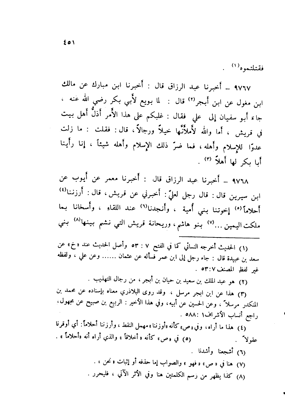 9768 - أَخْبَرَنَا عَبْدُ الرَّزَّاقِ قَالَ: أَخْبَرَنَا مَعْمَرٌ، عَنْ أَيُّوبَ، عَنِ ابْنِ سِيرِينَ قَالَ: قَالَ رَجُلٌ لِعَلِيٍّ: أَخْبِرْنِي عَنْ قُرَيْشٍ قَالَ: «§أَرْزَنُنَا أَحْلَامًا إِخْوَتُنَا بَنُو أُمَيَّةَ، وَأَنْجَدُنَا عِنْدَ اللِّقَاءِ، وَأَسْخَانَا بِمَا مَلَكَتِ الْيَمِينُ 000 بَنُو هَاشِمٍ، وَرَيْحَانَةُ قُرَيْشٍ الَّتِي نَشُمُّ بَيْنَهَا بَنُو الْمُغِيرَةِ، إِلَيْكَ عَنِّي سَائِرَ الْيَوْمِ»