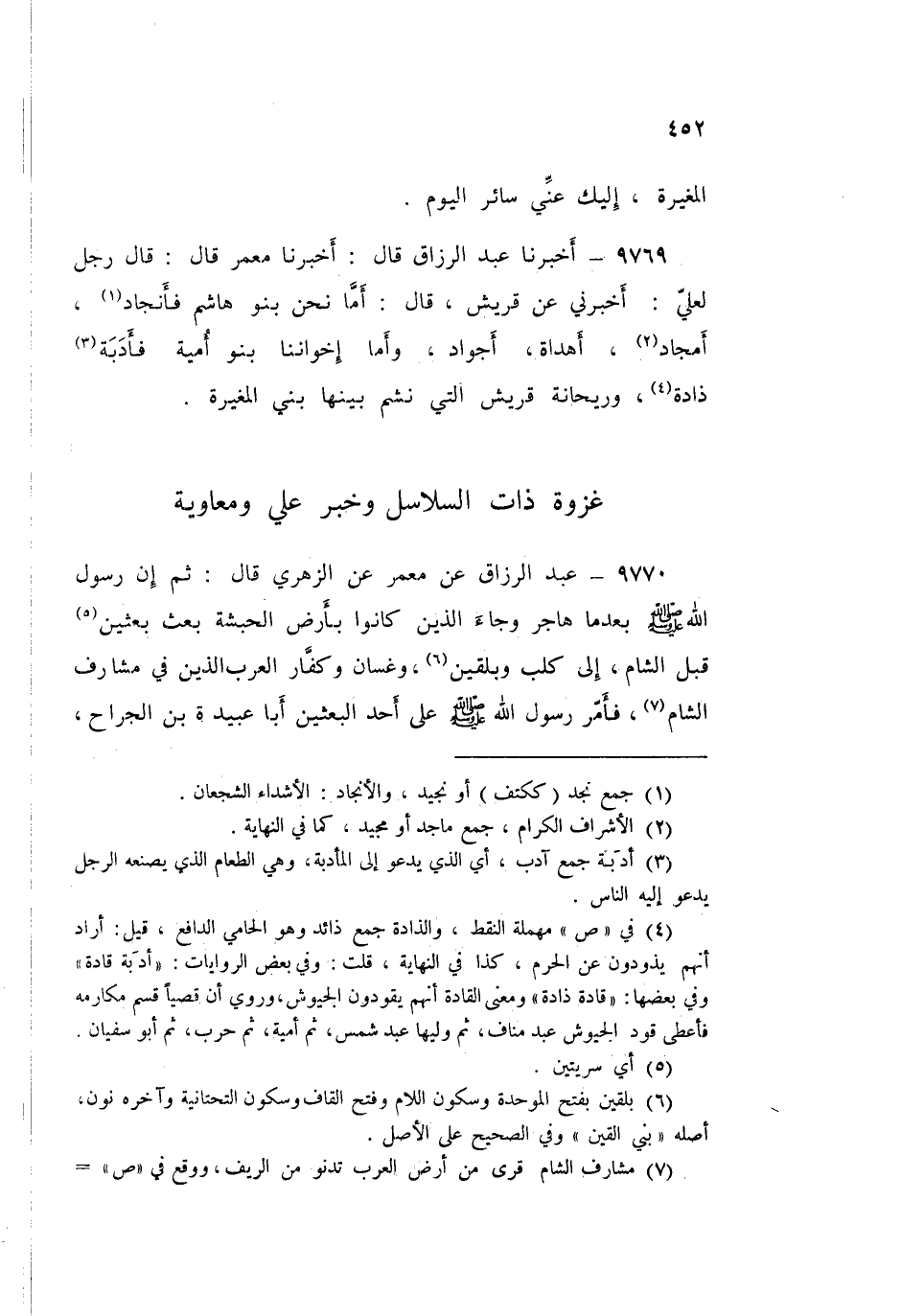 9769 - أَخْبَرَنَا عَبْدُ الرَّزَّاقِ قَالَ: أَخْبَرَنَا مَعْمَرٌ قَالَ: قَالَ رَجُلٌ لِعَلِيٍّ: أَخْبِرْنِي عَنْ قُرَيْشٍ قَالَ: «§أَمَّا نَحْنُ بَنُو هَاشِمٍ فَأَنْجَادٌ أَمْجَادٌ، أَهْدَاةٌ أَجْوَادٌ، وَأَمَّا إِخْوَانُنَا بَنُو أُمَيَّةَ فَأَدَبَةٌ ذَادَةٌ، وَرَيْحَانَةُ قُرَيْشٍ الَّتِي نَشُمُّ بَيْنَهَا بَنُو الْمُغِيرَةِ»