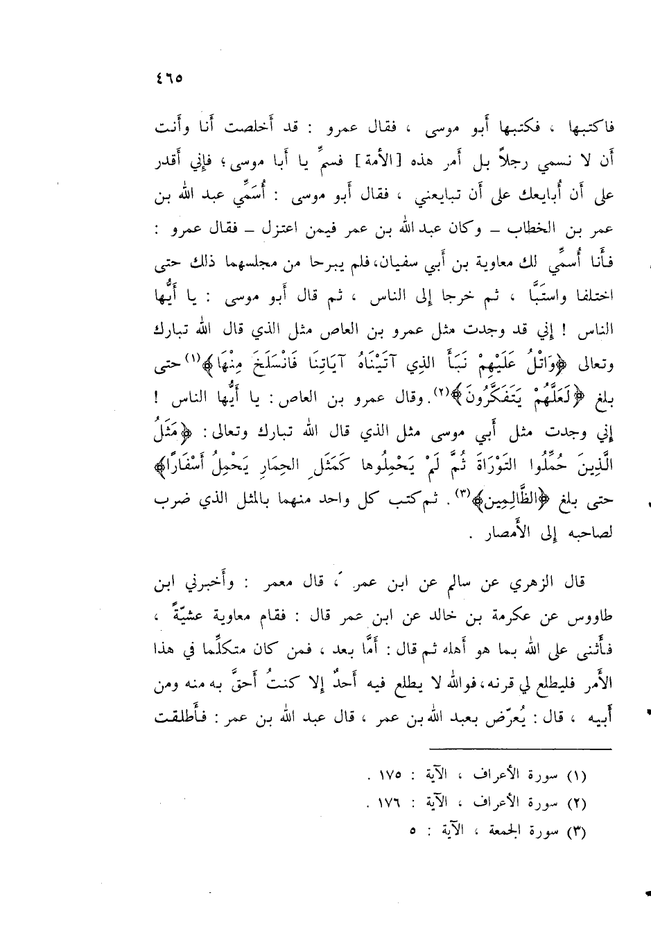 قَالَ الزُّهْرِيُّ: عَنْ سَالِمٍ، عَنِ ابْنِ عُمَرَ قَالَ مَعْمَرٌ: وَأَخْبَرَنِي ابْنُ طَاوُسٍ، عَنْ عِكْرِمَةَ بْنِ خَالِدٍ، عَنِ ابْنِ عُمَرَ قَالَ: فَقَامَ مُعَاوِيَةُ عَشِيَّةً فَأَثْنَى عَلَى اللَّهِ بِمَا هُوَ أَهْلُهُ ثُمَّ قَالَ: أَمَّا بَعْدُ، فَمَنْ كَانَ مُتَكَلِّمًا فِي هَذَا الْأَمْرِ، فَلْيُطْلِعْ لِي قَرْنَهُ، فَوَاللَّهِ لَا يَطْلُعُ فِيهِ أَحَدٌ إِلَّا كُنْتُ أَحَقَّ بِهِ مِنْهُ وَمَنْ أَبِيهِ - قَالَ: يُعَرِّضُ بِعَبْدِ اللَّهِ بْنِ عُمَرَ - قَالَ عَبْدُ اللَّهِ بْنُ عُمَرَ: " §فَأَطْلَقْتُ -[466]- حَبْوَتِي فَأَرَدْتُ أَنْ أَقُومَ إِلَيْهِ فَأَقُولَ: يَتَكَلَّمُ فِيهِ رِجَالٌ قَاتِلُوكَ وَأَبَاكَ عَلَى الْإِسْلَامِ، ثُمَّ خَشِيتُ أَنْ أَقُولَ كَلِمَةً تُفَرِّقُ بَيْنَ الْجَمْعِ، وَتُسْفَكُ فِيهِ الدِّمَاءُ، وَأُحْمَلُ فِيهِ عَلَى غَيْرِ رَأْيٍ، فَكَانَ مَا وَعَدَ اللَّهُ تَبَارَكَ وَتَعَالَى فِي الْجِنَانِ أَحَبَّ إِلَيَّ مِنْ ذَلِكَ قَالَ: فَلَمَّا انْطَلَقْتُ إِلَى مَنْزِلِي أَتَانِي حَبِيبُ بْنُ مَسْلَمَةَ فَقَالَ: مَا الَّذِي مَنَعَكَ أَنْ تَتَكَلَّمَ حِينَ سَمِعْتَ الرَّجُلَ أَنْ يَتَكَلَّمَ فَقُلْتُ لَهُ: لَقَدْ أَرَدْتُ ذَلِكَ ثُمَّ خَشِيتُ أَنْ أَقُولَ كَلِمَةً تُفَرِّقُ بَيْنَ الْجَمْعِ، وَتُسْفَكُ فِيهَا الدِّمَاءُ، وَأُحْمَلُ فِيهَا عَلَى غَيْرِ رَأْيٍ، فَكَانَ مَا وَعَدَ اللَّهُ تَبَارَكَ وَتَعَالَى فِي الْجِنَانِ أَحَبَّ إِلَيَّ مِنْ ذَلِكَ كُلِّهِ، فَقَالَ حَبِيبُ بْنُ مَسْلَمَةَ لِعَبْدِ اللَّهِ بْنِ عُمَرَ: فِدَاكَ أَبِي وَأُمِّي، فَإِنَّكَ عُصِمْتَ، وَحُفِظْتَ مِمَّا خِفْتَ عُرَّتَهُ "