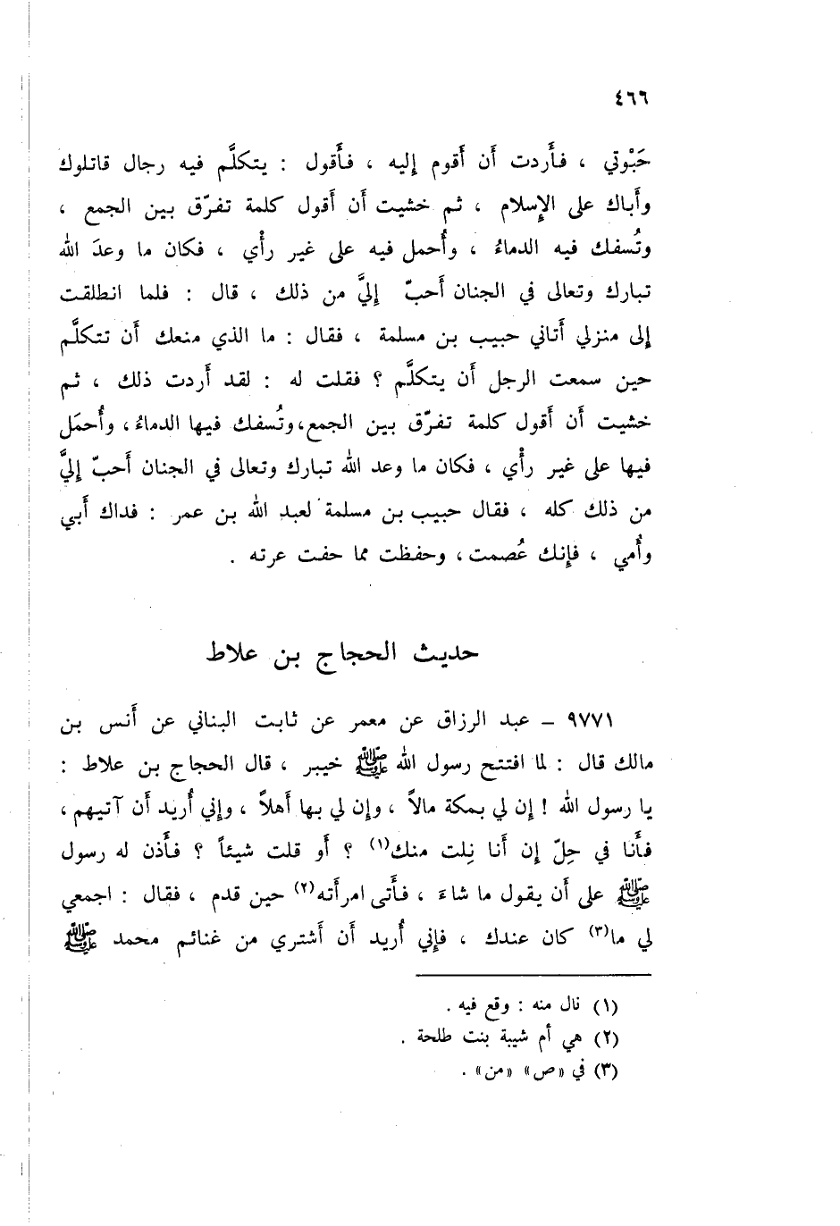 9771 - عَنْ مَعْمَرٍ، عَنْ ثَابِتٍ الْبُنَانِيِّ، عَنْ أَنَسِ بْنِ مَالِكٍ قَالَ: لَمَّا افْتَتَحَ رَسُولُ اللَّهِ صَلَّى اللهُ عَلَيْهِ وَسَلَّمَ خَبِيرَ قَالَ 58 الْحَجَّاجُ بْنُ عِلَاطٍ: §يَا رَسُولَ اللَّهِ إِنَّ لِي بِمَكَّةَ مَالًا، وَإِنَّ لِي بِهَا أَهْلًا، وَإِنِّي أُرِيدُ أَنْ آتِيَهُمْ، فَأَنَا فِي حَلٍّ إِنْ أَنَا نِلْتُ مِنْكَ أَوْ قُلْتُ شَيْئًا؟ " فَأَذِنَ لَهُ رَسُولُ اللَّهِ صَلَّى اللهُ عَلَيْهِ وَسَلَّمَ عَلَى أَنْ يَقُولَ مَا شَاءَ، فَأَتَى امْرَأَتَهُ حِينَ قَدِمَ فَقَالَ: «اجْمَعِي لِي مَا كَانَ عِنْدَكِ، فَإِنِّي أُرِيدُ أَنْ أَشْتَرِيَ مِنْ غَنَائِمِ مُحَمَّدٍ صَلَّى اللهُ عَلَيْهِ وَسَلَّمَ -[467]- وَأَصْحَابِهِ، فَإِنَّهُمْ قَدِ اسْتُبِيحُوا وَأُصِيبَتْ أَمْوَالُهُمْ» وَفَشَا ذَلِكَ بِمَكَّةَ فَانْقَمَعَ الْمُسْلِمُونَ، وَأَظْهَرَ الْمُشْرِكُونَ فَرَحًا وَسُرُورًا قَالَ: وَبَلَغَ الْخَبَرُ الْعَبَّاسَ بْنَ عَبْدِ الْمُطَّلِبِ، فَقَعَدَ وَجَعَلَ لَا يَسْتَطِيعُ أَنْ يَقُومَ " قَالَ مَعْمَرٌ: فَأَخْبَرَنِي عُثْمَانُ الْجَزَرِيُّ، عَنْ مِقْسَمٍ قَالَ: فَأَخَذَ ابْنًا لَهُ يُشْبِهُ رَسُولَ اللَّهِ صَلَّى اللهُ عَلَيْهِ وَسَلَّمَ يُقَالُ لَهُ: قُثَمٌ، فَاسْتَلْقَى فَوَضَعَهُ عَلَى صَدْرِهِ وَهُوَ يَقُولُ: حِبِّي قُثَمْ، شَبِيهُ ذِي الْأَنْفِ الْأَشَمْ، نَبِيِّ رَبٍّ ذِي النِّعَمْ، بِرَغْمِ أَنْفِ مَنْ رَغِمْ قَالَ ثَابِتٌ: قَالَ أَنَسٌ: ثُمَّ أَرْسَلَ غُلَامًا لَهُ إِلَى الْحَجَّاجِ: مَاذَا جِئْتَ بِهِ؟ وَمَاذَا تَقُومُ؟ فَمَا وَعَدَ اللَّهُ خَيْرٌ مِمَّا جِئْتَ بِهِ قَالَ: فَقَالَ الْحَجَّاجُ بْنُ عِلَاطٍ: " اقْرَأْ عَلَى أَبِي الْفَضْلِ السَّلَامَ، وَقُلْ لَهُ: فَلْيَخْلُ فِي بَعْضِ بُيُوتِهِ لِآتِيَهُ، فَإِنَّ الْخَبَرَ عَلَى مَا يَسُرُّهُ " قَالَ: فَجَاءَهُ غُلَامُهُ، فَلَمَّا بَلَغَ بَابَ الدَّارِ قَالَ: «أَبْشِرْ يَا أَبَا الْفَضْلِ» قَالَ: فَوَثَبَ الْعَبَّاسُ فَرَحًا حَتَّى قَبَّلَ بَيْنَ عَيْنَيْهِ، فَأَخْبَرَهُ بِمَا قَالَ الْحَجَّاجُ فَأَعْتَقَهُ قَالَ: ثُمَّ جَاءَهُ الْحَجَّاجُ فَأَخْبَرَهُ أَنَّ رَسُولَ اللَّهِ صَلَّى اللهُ عَلَيْهِ وَسَلَّمَ قَدِ افْتَتَحَ خَيْبَرَ، وَغَنِمَ أَمْوَالَهُمْ، وَجَرَتْ سِهَامُ اللَّهِ تَبَارَكَ وَتَعَالَى فِي أَمْوَالِهِمْ، وَاصْطَفَى رَسُولُ اللَّهِ صَلَّى اللهُ عَلَيْهِ وَسَلَّمَ صَفِيَّةَ ابْنَةَ حُيَيٍّ فَأَخَذَهَا لِنَفْسِهِ، وَخَيَّرَهَا بَيْنَ أَنْ يُعْتِقَهَا وَتَكُونَ زَوْجَهُ، أَوْ تَلْحَقَ بِأَهْلِهَا، فَاخْتَارَتْ أَنْ يُعْتِقَهَا وَتَكُونَ زَوْجَهُ، وَلَكِنِّي جِئْتُ لِمَالٍ كَانَ لِي هَاهُنَا أَرَدْتُ أَنْ أَجْمَعَهُ فَأَذْهَبَ -[468]- بِهِ فَاسْتَأْذَنْتُ رَسُولَ اللَّهِ فَأَذِنَ لِي أَنْ أَقُولَ مَا شِئْتُ «وَأَخْفِ عَنِّي - ثَلَاثًا - ثُمَّ اذْكُرْ مَا بَدَا لَكَ» قَالَ: فَجَمَعَتِ امْرَأَتُهُ مَا كَانَ عِنْدَهَا مِنْ حُلِيٍّ وَمَتَاعٍ، فَدَفَعَتْهُ إِلَيْهِ ثُمَّ انْشَمَرَ بِهِ، فَلَمَّا كَانَ بَعْدَ ثَلَاثٍ أَتَى الْعَبَّاسُ امْرَأَةَ الْحَجَّاجِ فَقَالَ: مَا فَعَلَ زَوْجُكِ؟ فَأَخْبَرَتْهُ أَنْ قَدْ ذَهَبَ يَوْمَ كَذَا وَكَذَا، وَقَالَتْ: لَا يُخْزِيكَ اللَّهُ يَا أَبَا الْفَضْلِ، لَقَدْ شَقَّ عَلَيْنَا الَّذِي بَلَغَكَ قَالَ: أَجَلْ فَلَا يُخْزِينِي اللَّهُ، وَلَمْ يَكُنْ بِحَمْدِ اللَّهِ إِلَّا مَا أَحْبَبْنَا، فَتْحَ اللَّهُ تَبَارَكَ وَتَعَالَى خَيْبَرَ عَلَى رَسُولِهِ صَلَّى اللهُ عَلَيْهِ وَسَلَّمَ فَأَذِنَ لِي أَنْ أَقُولَ مَا شِئْتُ «وَأَخْفِ عَنِّي - ثَلَاثًا - ثُمَّ اذْكُرْ مَا بَدَا لَكَ» قَالَ: فَجَمَعَتِ امْرَأَتُهُ مَا كَانَ عِنْدَهَا مِنْ حُلِيٍّ وَمَتَاعٍ، فَدَفَعَتْهُ 