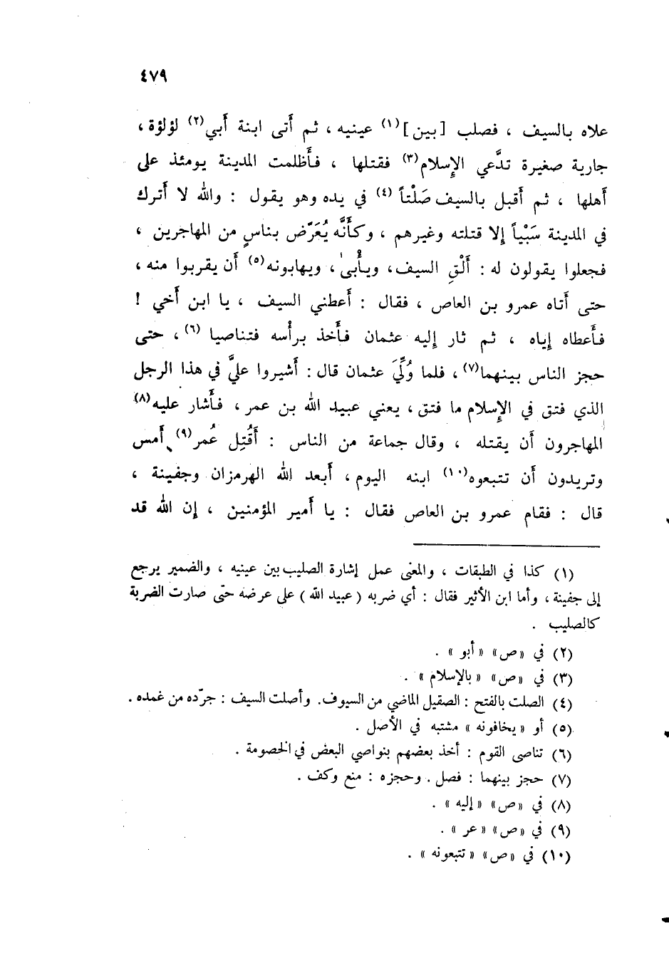عَلَاهُ بِالسَّيْفِ فَصُلِبَ بَيْنَ عَيْنَيْهِ، ثُمَّ أَتَى ابْنَةَ أَبِي لُؤْلُؤَةَ جَارِيَةٌ صَغِيرَةٌ تَدَّعِي الْإِسْلَامَ - فَقَتَلَهَا، فَأَظْلَمَتِ الْمَدِينَةُ يَوْمَئِذٍ عَلَى أَهْلِهَا، ثُمَّ أَقْبَلَ بِالسَّيْفِ صَلْتًا فِي يَدَهِ وَهُوَ يَقُولُ: وَاللَّهِ لَا أَتْرُكُ فِي الْمَدِينَةِ سَبْيًا إِلَّا قَتَلْتُهُ وَغَيْرَهُمْ - وَكَأَنَّهُ يُعَرِّضُ بِنَاسٍ مِنَ الْمُهَاجِرِينَ - فَجَعَلُوا يَقُولُونَ لَهُ: أَلْقِ السَّيْفَ، وَيَأْبَى وَيَهَابُونَهُ أَنْ يَقْرَبُوا مِنْهُ، حَتَّى أَتَاهُ عَمْرُو بْنُ الْعَاصِ فَقَالَ: أَعْطِنِي السَّيْفَ يَا ابْنَ أَخِي، فَأَعْطَاهُ إِيَّاهُ، ثُمَّ ثَارَ إِلَيْهِ عُثْمَانُ فَأَخَذَ بِرَأْسِهِ فَتَنَاصَيَا حَتَّى حَجَزَ النَّاسُ بَيْنَهُمَا، فَلَمَّا وُلِّيَ عُثْمَانُ قَالَ: أَشِيرُوا عَلَيَّ فِي هَذَا الرَّجُلِ الَّذِي فَتَقَ فِي الْإِسْلَامِ مَا فَتَقَ - يَعْنِي عُبَيْدَ اللَّهِ بْنَ عُمَرَ - فَأَشَارَ عَلَيْهِ الْمُهَاجِرُونَ أَنْ يَقْتُلَهُ، وَقَالَ جَمَاعَةٌ مِنَ النَّاسِ: أَقُتِلَ عُمَرُ أَمْسَ وَتُرِيدُونَ أَنْ تُتْبِعُوهُ ابْنَهُ الْيَوْمَ؟ أَبْعَدَ اللَّهُ الْهُرْمُزَانَ وَجُفَيْنَهَ قَالَ: فَقَامَ عَمْرُو بْنُ الْعَاصِ فَقَالَ: يَا أَمِيرَ الْمُؤْمِنِينَ إِنَّ اللَّهَ قَدْ