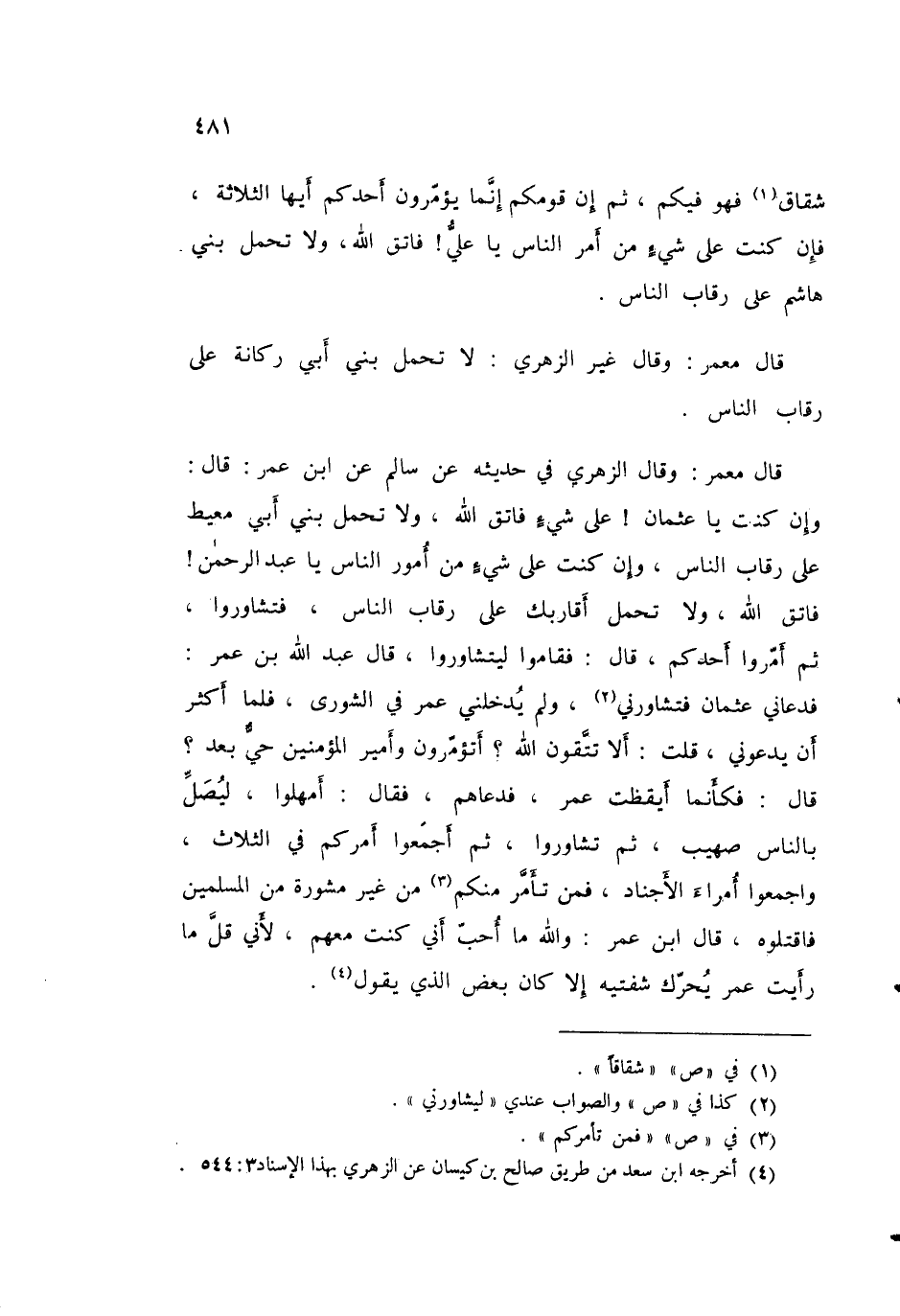 قَالَ مَعْمَرٌ: وَقَالَ الزُّهْرِيُّ فِي حَدِيثِهِ، عَنْ سَالِمٍ، عَنِ ابْنِ عُمَرَ قَالَ: وَإِنْ كُنْتَ يَا عُثْمَانُ عَلَى شَيْءٍ فَاتَّقِ اللَّهَ، وَلَا تَحْمِلْ بَنِي أَبِي مُعَيْطٍ عَلَى رِقَابِ النَّاسِ، وَإِنْ كُنْتَ عَلَى شَيْءٍ مِنْ أُمُورِ النَّاسِ يَا عَبْدَ الرَّحْمَنِ فَاتَّقِ اللَّهَ، وَلَا تَحْمِلْ أَقَارِبَكَ عَلَى رِقَابِ النَّاسِ، فَتَشَاوَرُوا، ثُمَّ أَمِّرُوا أَحَدَكُمْ قَالَ: فَقَامُوا لِيَتَشَاوَرُوا، قَالَ عَبْدُ اللَّهِ بْنُ عُمَرَ، فَدَعَانِي عُثْمَانُ فتشَاوِرَنِي وَلَمْ يُدْخِلُنِي عُمَرُ فِي الشُّورَى، فَلَمَّا أَكْثَرَ أَنْ يَدْعُونِي قُلْتُ: أَلَا تَتَّقُونَ اللَّهَ؟ أَتُؤَمِّرُونَ وَأَمِيرُ الْمُؤْمِنِينَ حَيٌّ بَعْدُ؟ قَالَ: فَكَأَنَّمَا أَيْقَظْتُ عُمَرَ فَدَعَاهُمْ فَقَالَ: أَمْهِلُوا، لِيُصَلِّ بِالنَّاسِ صُهَيْبٌ، ثُمَّ تَشَاوَرُوا، ثُمَّ أَجْمِعُوا أَمَرَكُمْ فِي الثَّلَاثِ، وَاجْمَعُوا أُمَرَاءَ الْأَجْنَادِ، فَمَنْ تَأَمَّرَ مِنْكُمْ مِنْ غَيْرِ مَشُورَةٍ مِنَ الْمُسْلِمِينَ فَاقْتُلُوهُ. قَالَ ابْنُ عُمَرَ: «§وَاللَّهِ مَا أُحِبُّ أَنِّي كُنْتُ مَعَهُمْ، لِأَنِّي قَلَّ مَا رَأَيْتُ عُمَرَ يُحَرِّكُ شَفَتَيْهِ إِلَّا كَانَ بَعْضُ الَّذِي يَقُولُ» -[482]- قَالَ الزُّهْرِيُّ: فَلَمَّا مَاتَ عُمَرُ اجْتَمَعُوا، فَقَالَ لَهُمْ عَبْدُ الرَّحْمَنِ بْنُ عَوْفٍ: إِنْ شِئْتُمُ اخْتَرْتُ لَكُمْ مِنْكُمْ، فَوَلَّوهُ ذَلِكَ، قَالَ الْمِسْوَرُ: فَمَا رَأَيْتُ مِثْلَ عَبْدِ الرَّحْمَنِ، وَاللَّهِ مَا تَرَكَ أَحَدًا مِنَ الْمُهَاجِرِينَ وَالْأَنْصَارِ وَلَا ذَوِي غَيْرِهِمْ مِنْ ذَوِي الرَّأْيِ إِلَّا اسْتَشَارَهُمْ تِلْكَ اللَّيْلَةَ