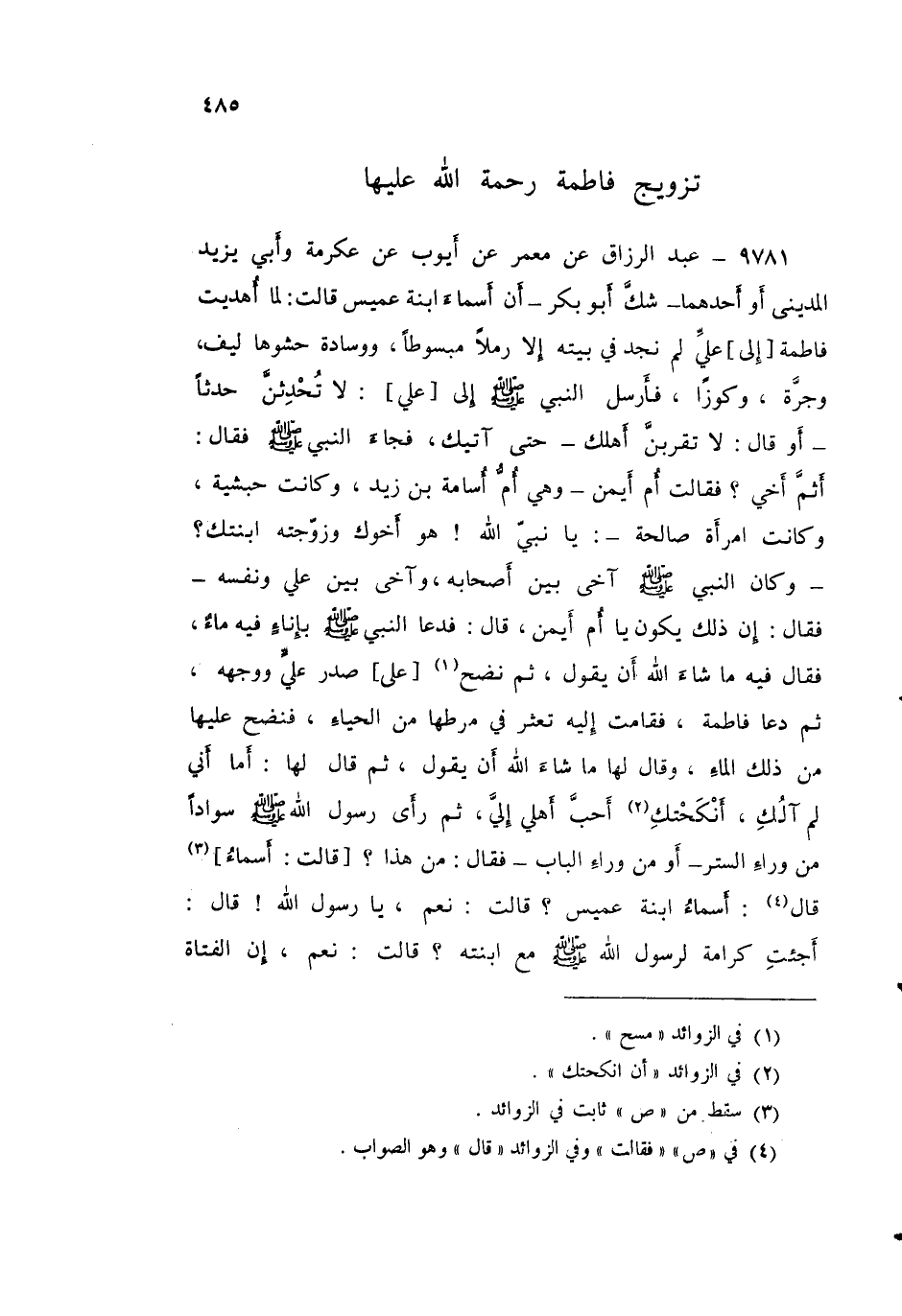 9781 - عَنْ مَعْمَرٍ، عَنْ أَيُّوبَ، عَنْ عِكْرِمَةَ، وَأَبِي يَزِيدِ الْمَدِينِيِّ أَوْ أَحَدِهِمَا - شَكَّ أَبُو بَكْرٍ - أَنَّ أَسْمَاءَ ابْنَةَ عُمَيْسٍ قَالَتْ: لَمَّا أُهْدِيَتْ فَاطِمَةُ إِلَى عَلِيٍّ لَمْ نَجِدْ فِي بَيْتِهِ إِلَّا رَمْلًا مَبْسُوطًا، وَوِسَادَةً حَشْوُهَا لِيفٌ، وَجَرَّةً وَكَوْزًا، فَأَرْسَلَ النَّبِيُّ صَلَّى اللهُ عَلَيْهِ وَسَلَّمَ إِلَى عَلِيٍّ: «لَا تُحْدِثَنَّ حَدَثًا» أَوْ قَالَ: «لَا تَقْرَبَنَّ أَهْلَكَ حَتَّى آتِيَكَ» فَجَاءَ النَّبِيُّ صَلَّى اللهُ عَلَيْهِ وَسَلَّمَ فَقَالَ: «§أَثَمَّ أَخِي؟» فَقَالَتْ أُمُّ أَيْمَنَ وَهِيَ أُمُّ أُسَامَةَ بْنِ زَيْدٍ، وَكَانَتْ حَبَشِيَّةً، وَكَانَتِ امْرَأَةً صَالِحَةً - يَا نَبِيَّ اللَّهِ هُوَ أَخُوكَ وَزَوَّجْتَهُ ابْنَتَكَ؟ - وَكَانَ النَّبِيُّ صَلَّى اللهُ عَلَيْهِ وَسَلَّمَ آخَى بَيْنَ أَصْحَابِهِ وَآخَى بَيْنَ عَلِيٍّ وَنَفْسِهِ - فَقَالَ: «إِنَّ ذَلِكَ يَكُونُ يَا أُمَّ أَيْمَنَ» قَالَ: فَدَعَا النَّبِيُّ صَلَّى اللهُ عَلَيْهِ وَسَلَّمَ بِإِنَاءٍ فِيهِ مَاءٌ، فَقَالَ فِيهِ مَا شَاءَ اللَّهُ أَنْ يَقُولَ، ثُمَّ نَضَحَ عَلَى صَدْرِ عَلِيٍّ وَوَجْهِهِ، ثُمَّ دَعَا فَاطِمَةَ فَقَامَتْ إِلَيْهِ تَعْثُرُ فِي مِرْطِهَا مِنَ الْحَيَاءِ، فَنَضَحَ عَلَيْهَا مِنْ ذَلِكَ الْمَاءِ، وَقَالَ لَهَا مَا شَاءَ اللَّهُ أَنْ يَقُولَ، ثُمَّ قَالَ لَهَا: " أَمَا إِنِّي لَمْ آلُكِ، أَنْكَحْتُكِ أَحَبَّ أَهْلِي إِلَيَّ، ثُمَّ رَأَى رَسُولُ اللَّهِ صَلَّى اللهُ عَلَيْهِ وَسَلَّمَ سَوَادًا مِنْ وَرَاءِ السِّتْرِ أَوْ مِنْ وَرَاءِ الْبَابِ فَقَالَ: «مَنْ هَذَا؟» قَالَتْ: أَسْمَاءُ قَالَ: «أَسْمَاءُ ابْنَةُ عُمَيْسٍ؟» قَالَتْ: نَعَمْ يَا رَسُولَ اللَّهِ قَالَ: «أَجِئْتِ كَرَامَةً لِرَسُولِ اللَّهِ صَلَّى اللهُ عَلَيْهِ وَسَلَّمَ مَعَ ابْنَتِهِ؟» قَالَتْ: نَعَمْ، إِنَّ الْفَتَاةَ -[486]- لَيْلَةَ يُبْنَى بِهَا لَا بُدَّ لَهَا مِنِ امْرَأَةٍ تَكُونُ قَرِيبًا مِنْهَا، إِنْ عَرَضَتْ حَاجَةٌ أَفْضَتْ بِذَلِكَ إِلَيْهَا قَالَتْ: فَدَعَا لِي دُعَاءً إِنَّهُ لَأَوْثَقُ عَمَلِي عِنْدِي، ثُمَّ قَالَ لِعَلِيٍّ: «دُونَكَ أَهْلَكَ» ثُمَّ خَرَجَ فَوَلَّى قَالَتْ: فَمَا زَالَ يَدْعُو لَهُمَا حَتَّى تَوَارَى فِي حُجَرِهِ