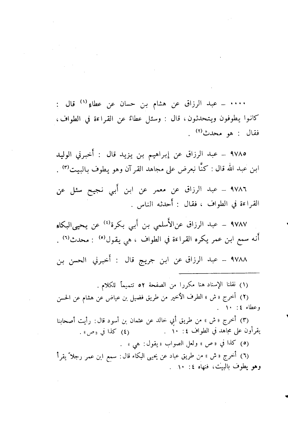 9786 - عَنْ مَعْمَرٍ، عَنِ ابْنِ أَبِي نَجِيحٍ سُئِلَ عَنِ §الْقِرَاءَةِ فِي الطَّوَافِ، فَقَالَ: «أَحْدَثَهُ النَّاسُ»