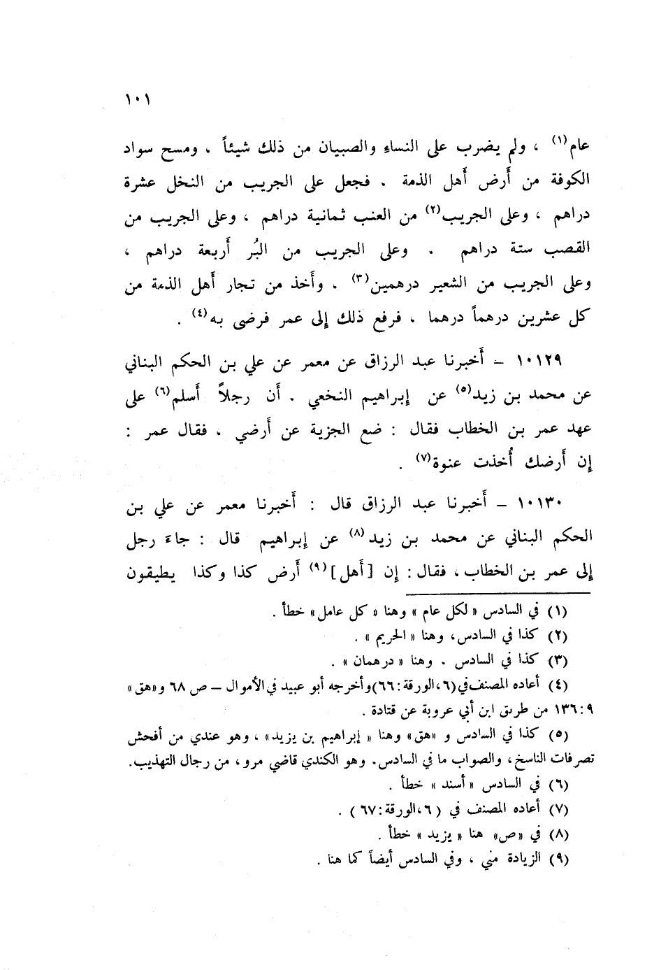10129 - أَخْبَرَنَا عَبْدُ الرَّزَّاقِ قَالَ: عَنْ مَعْمَرٍ، عَنْ عَلِيِّ بْنِ الْحَكَمِ الْبُنَانِيِّ، عَنْ مُحَمَّدِ بْنِ زَيْدٍ، عَنْ إِبْرَاهِيمَ النَّخَعِيِّ: أَنَّ رَجُلًا أَسْلَمَ عَلَى عَهْدِ عُمَرَ بْنِ الْخَطَّابِ، فَقَالَ: §ضَعِ الْجِزْيَةَ عَنْ أَرْضِي، فَقَالَ عُمَرُ: إِنَّ أَرْضَكَ أُخِذَتْ عَنْوَةً "