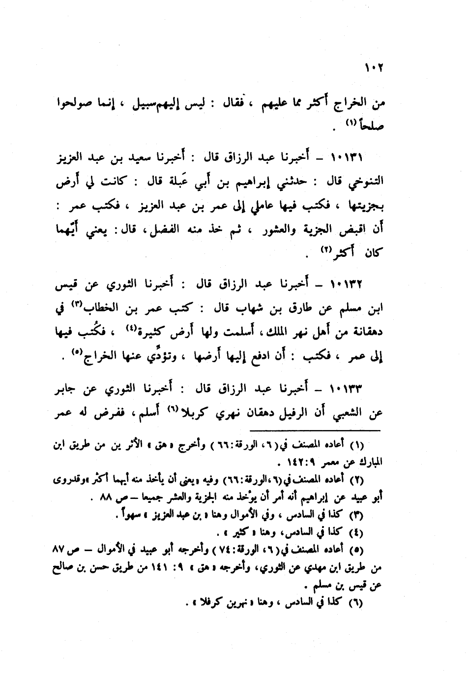10131 - أَخْبَرَنَا عَبْدُ الرَّزَّاقِ قَالَ: أَخْبَرَنَا الثَّوْرِيُّ، عَنْ قَيْسِ بْنِ مُسْلِمٍ، عَنْ طَارِقِ بْنِ شِهَابٍ قَالَ: كَتَبَ عُمَرُ بْنُ الْخَطَّابِ فِي دِهْقَانَةٍ مِنْ أَهْلِ نَهْرِ الْمَلِكِ أَسْلَمَتْ، وَلَهَا أَرْضٌ كَثِيرَةٌ، فَكَتَبَ فِيهَا إِلَى عُمَرَ، فَكَتَبَ: «§أَنِ ادْفَعْ إِلَيْهَا أَرْضَهَا، وَتُؤَدِّي عَنْهَا الْخَرَاجَ»