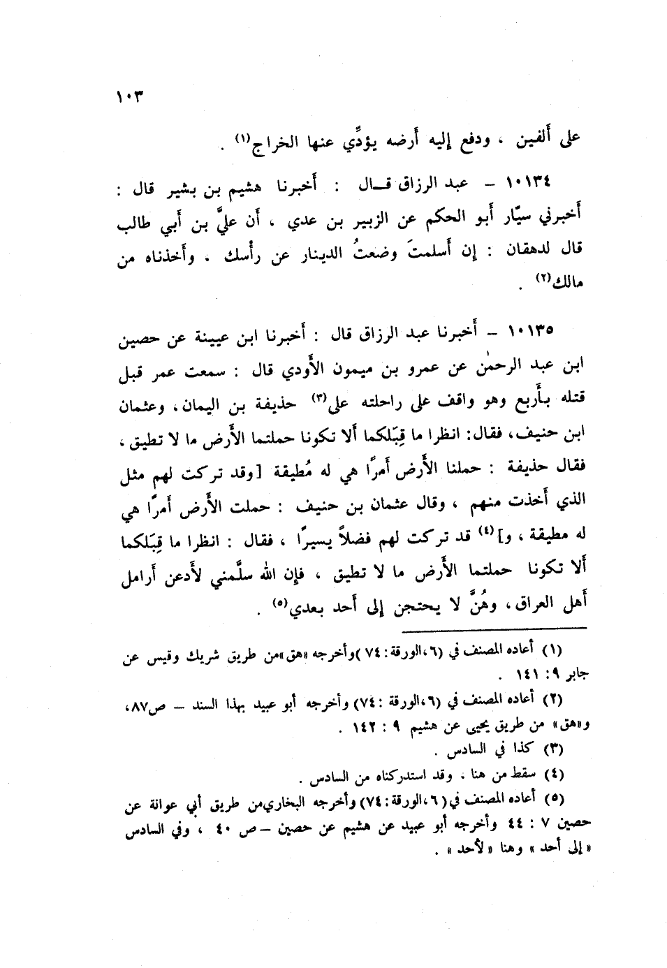 10135 - عَبْدُ الرَّزَّاقِ قَالَ: أَخْبَرَنَا ابْنُ عُيَيْنَةَ، عَنْ حُصَيْنِ بْنِ عَبْدِ الرَّحْمَنِ، عَنْ عَمْرِو بْنِ مَيْمُونٍ الْأَوْدِيِّ قَالَ: سَمِعْتُ عُمَرَ قَبْلَ قَتْلِهِ بِأَرْبَعٍ، وَهُوَ وَاقِفٌ عَلَى رَاحِلَتِهِ عَلَى حُذَيْفَةَ بْنِ الْيَمَانِ، وَعُثْمَانَ بْنِ حُنَيْفٍ، فَقَالَ: «§انْظُرَا مَا قِبَلَكُمَا أَلَّا تَكُونَا حَمَّلْتُمَا الْأَرْضَ مَا لَا تُطِيقُ»، فَقَالَ حُذَيْفَةُ: «حَمَّلْنَا الْأَرْضَ أَمْرًا هِيَ لَهُ مُطِيقَةٌ، وَقَدْ تَرَكْتُ لَهُمْ مِثْلَ الَّذِي أَخَذْتُ مِنْهُمْ»، وَقَالَ عُثْمَانُ بْنُ حُنَيْفٍ: «حَمَّلْتُ الْأَرْضَ أَمْرًا هِيَ لَهُ مُطِيقَةٌ، وَقَدْ تَرَكْتُ لَهُمْ فَضْلًا يَسِيرًا»، فَقَالَ: «انْظُرَا مَا قِبَلَكُمَا أَلَّا تَكُونَا حَمَّلْتُمَا الْأَرْضِ مَا لَا تُطِيقُ، فَإِنِ اللَّهُ سَلَّمَنِي لَأَدَعَنَّ أَرَامِلَ أَهْلِ الْعِرَاقِ، وَهُنَّ لَا يَحْتَجْنَ إِلَى أَحَدٍ بَعْدِي»
