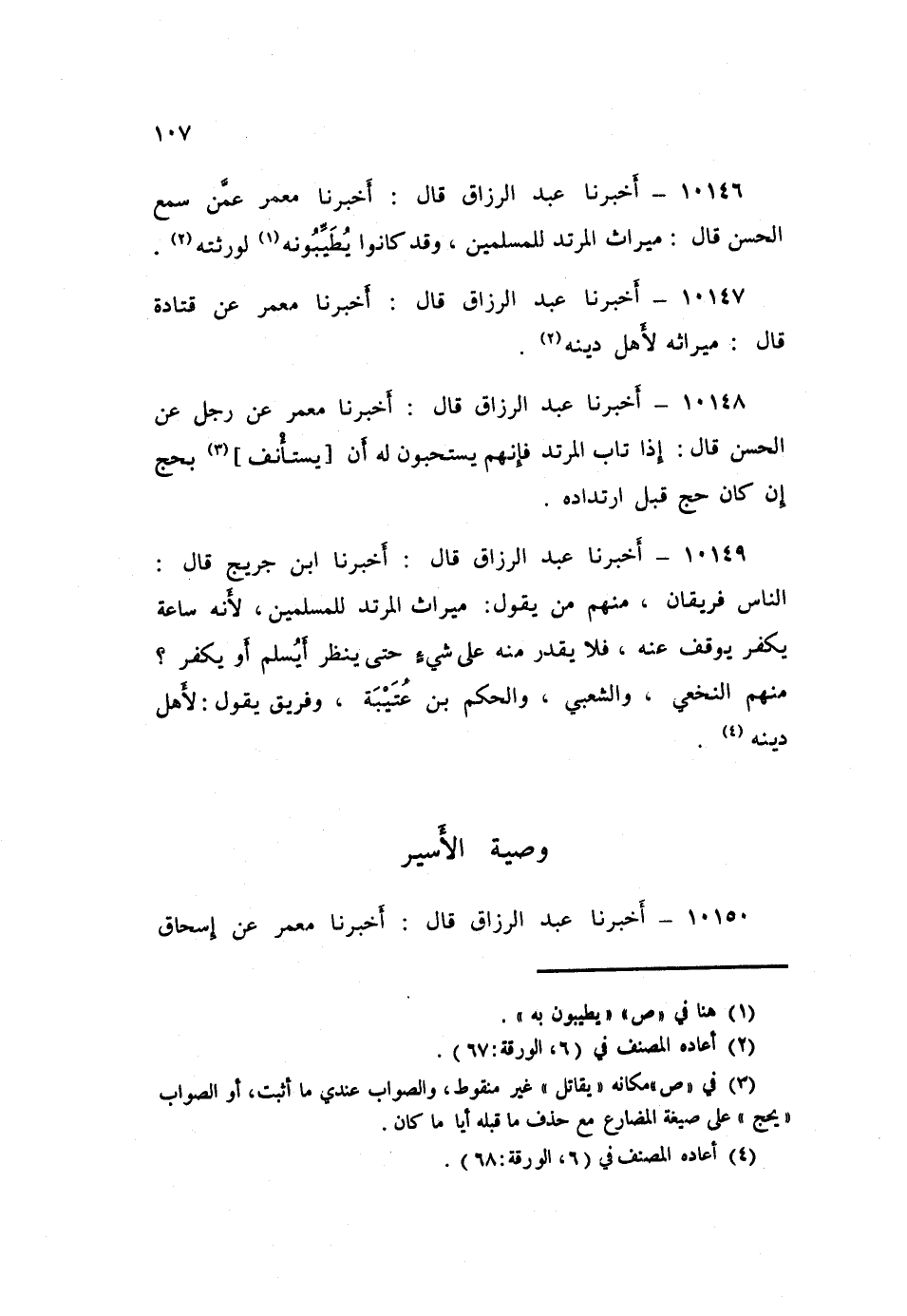 10150 - عَبْدُ الرَّزَّاقِ قَالَ: أَخْبَرَنَا مَعْمَرٌ، عَنْ إِسْحَاقَ بْنِ رَاشِدٍ، وَغَيْرِهِ مِنْ أَهْلِ الْجَزِيرَةِ: أَنَّ عُمَرَ بْنَ عَبْدِ الْعَزِيزِ كَتَبَ أَنْ: «§أَجِزْ وَصِيَّةَ الْأَسِيرِ»