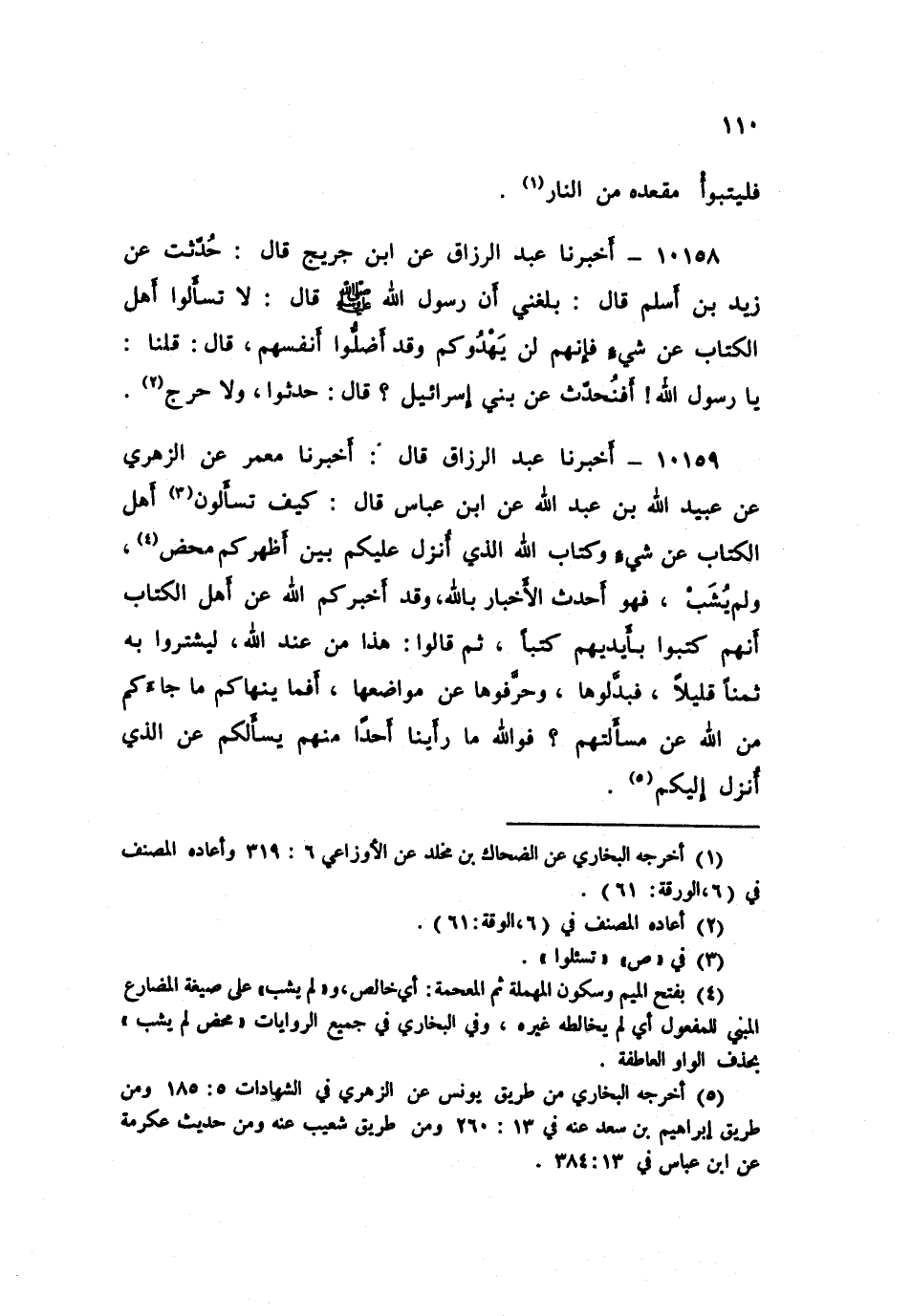 10158 - أَخْبَرَنَا عَبْدُ الرَّزَّاقِ قَالَ: عَنِ ابْنِ جُرَيْجٍ قَالَ: حُدَّثْتُ، عَنْ زَيْدِ بْنِ أَسْلَمَ قَالَ: بَلَغَنِي أَنَّ رَسُولَ اللَّهِ صَلَّى اللهُ عَلَيْهِ وَسَلَّمَ قَالَ: «§لَا تَسْأَلُوا أَهْلَ الْكِتَابِ عَنْ شَيْءٍ، فَإِنَّهُمْ لَنْ يَهْدُوكُمْ، وَقَدْ أَضَلُّوا أَنْفُسَهُمْ» قَالَ: قُلْنَا: يَا رَسُولَ اللَّهِ، أَفَنُحَدِّثُ عَنْ بَنِي إِسْرَائِيلَ؟ قَالَ: «حَدِّثُوا وَلَا حَرَجَ»