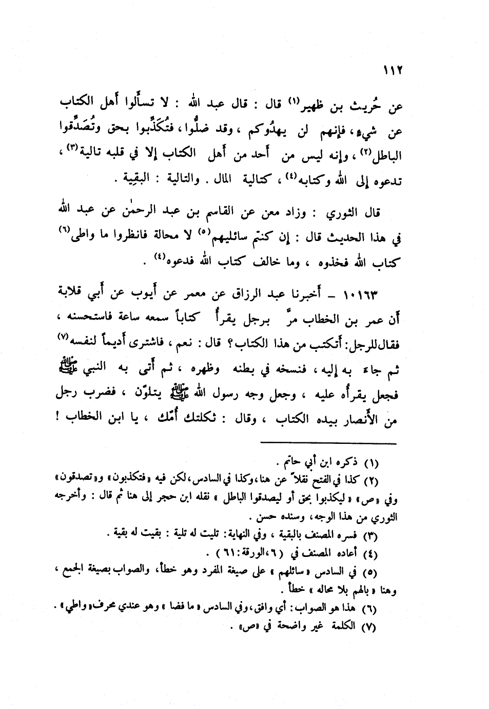 10163 - أَخْبَرَنَا عَبْدُ الرَّزَّاقِ قَالَ: عَنْ مَعْمَرٍ، عَنْ أَيُّوبَ، عَنْ أَبِي قِلَابَةَ، أَنَّ عُمَرَ بْنَ الْخَطَّابِ مَرَّ بِرَجُلٍ يَقْرَأُ كِتَابًا سَمِعَهُ سَاعَةً، فَاسْتَحْسَنَهُ فَقَالَ لِلرَّجُلِ: أَتَكْتُبُ مِنْ هَذَا الْكِتَابِ؟ قَالَ: نَعَمْ، فَاشْتَرَى أَدِيمًا لِنَفْسِهِ، ثُمَّ جَاءَ بِهِ إِلَيْهِ فَنَسَخَهُ فِي بَطْنِهِ وَظَهْرِهِ، ثُمَّ أَتَى بِهِ النَّبِيَّ صَلَّى اللهُ عَلَيْهِ وَسَلَّمَ، فَجَعَلَ يَقْرَأُهُ عَلَيْهِ، وَجَعَلَ وَجْهُ رَسُولِ اللَّهِ صَلَّى اللهُ عَلَيْهِ وَسَلَّمَ يَتَلَوَّنُ، فَضَرَبَ رَجُلٌ مِنَ الْأَنْصَارِ بِيَدِهِ الْكِتَابَ، وَقَالَ: ثَكِلَتْكَ أُمُّكَ يَا ابْنَ الْخَطَّابِ -[113]-، أَلَا تَرَى إِلَى وَجْهِ رَسُولِ اللَّهِ صَلَّى اللهُ عَلَيْهِ وَسَلَّمَ مُنْذُ الْيَوْمِ وَأَنْتَ تَقْرَأُ هَذَا الْكِتَابَ؟ فَقَالَ النَّبِيُّ صَلَّى اللهُ عَلَيْهِ وَسَلَّمَ عِنْدَ ذَلِكَ: «§إِنَّمَا بُعِثْتُ فَاتِحًا وَخَاتَمًا، وَأُعْطِيتُ جَوَامِعَ الْكَلِمِ وَفَوَاتِحَهُ، وَاخْتُصِرَ لِي الْحَدِيثُ اخْتِصَارًا، فَلَا يُهْلِكَنَّكُمُ الْمُتَهَوِّكُونَ»