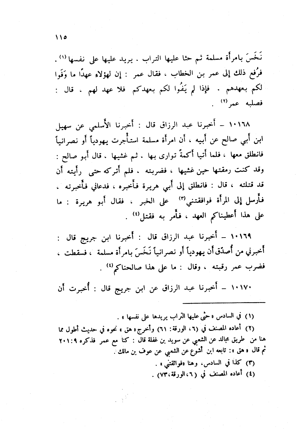 10169 - عَبْدُ الرَّزَّاقِ قَالَ: أَخْبَرَنَا ابْنُ جُرَيْجٍ قَالَ: أَخْبَرَنِي مَنْ أُصَدِّقُ: أَنَّ §يَهُودِيًّا أَوْ نَصْرَانِيًّا نَخَسَ بِامْرَأَةٍ مُسْلِمَةٍ فَسَقَطَتْ، فَضَرَبَ عُمَرُ رَقَبَتَهُ، وَقَالَ: «مَا عَلَى هَذَا صَالَحْنَاكُمْ»