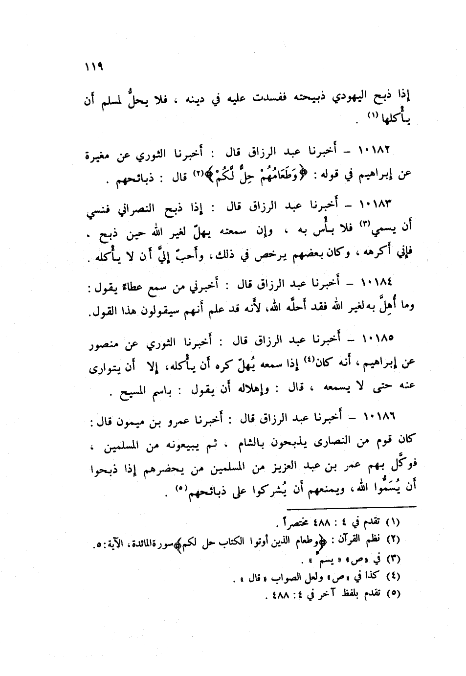 10186 - عَبْدُ الرَّزَّاقِ قَالَ: أَخْبَرَنَا عَمْرُو بْنُ مَيْمُونٍ قَالَ: «كَانَ قَوْمٌ مِنَ النَّصَارَى يَذْبَحُونَ بِالشَّامِ، ثُمَّ يَبِيعُونَهُ مِنَ الْمُسْلِمِينَ فَوَكَّلَ بِهِمْ عُمَرُ بْنُ عَبْدِ الْعَزِيزِ مِنَ الْمُسْلِمِينَ مَنْ يَحْضُرُهُمْ §إِذَا ذَبَحُوا أَنْ يُسَمُّوا اللَّهَ، وَيَمْنَعَهُمْ أَنْ يُشْرِكُوا عَلَى ذَبَائِحِهِمْ»