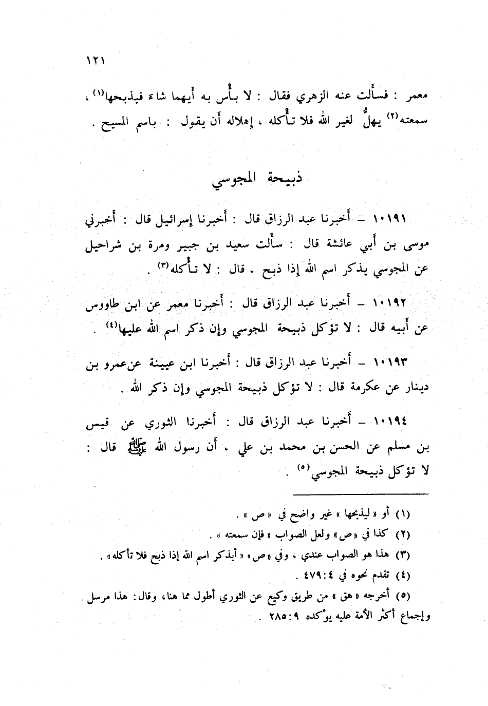 10194 - عَبْدُ الرَّزَّاقِ قَالَ: أَخْبَرَنَا الثَّوْرِيُّ، عَنْ قَيْسِ بْنِ مُسْلِمٍ، عَنِ الْحَسَنِ بْنِ مُحَمَّدِ بْنِ عَلِيٍّ: أَنَّ رَسُولَ اللَّهِ صَلَّى اللهُ عَلَيْهِ وَسَلَّمَ قَالَ: «§لَا تُؤْكَلْ ذَبِيحَةُ الْمَجُوسِيِّ»