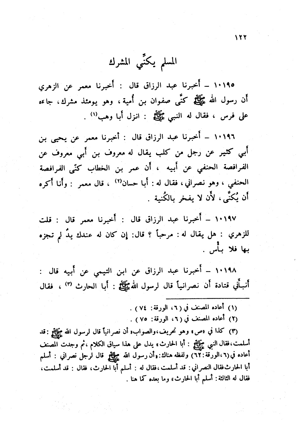 10196 - عَبْدُ الرَّزَّاقِ قَالَ: أَخْبَرَنَا مَعْمَرٌ، عَنْ يَحْيَى بْنِ أَبِي كَثِيرٍ، عَنْ رَجُلٍ مَنْ كَلْبٍ يُقَالُ لَهُ: مَعْرُوفُ بْنُ أَبِي مَعْرُوفٍ، عَنِ الْفَرَافِصَةِ الْحَنَفِيِّ، عَنْ أَبِيهِ، أَنَّ عُمَرَ بْنَ الْخَطَّابِ §كَنَّى الْفَرَافِصَةَ الْحَنَفِيَّ، وَهُوَ نَصْرَانِيٌّ، فَقَالَ لَهُ: «أَبَا حَسَّانَ»، قَالَ مَعْمَرٌ: «وَأَنَا أَكْرَهُ أَنْ يُكَنَّى لِأَنْ لَا يَفْخَرَ بِالْكُنْيَةِ»